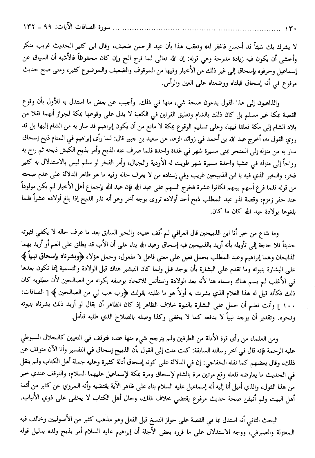 ومن العلماء من رأى قوة الأدلة من الطرفين ولم يترجح شيء منها عنده فتوقف في التعيين كالجلال السيوطي عليه الرحمة فإنه قال في آخر رسالته السابقة: كنت ملت إلى القول بأن الذبيح إسحاق في التفسير وأنا الآن متوقف عن ذلك، وقال بعضهم كما نقله الخفاجي: إن في الدلالة على كونه إسحاق أدلة كثيرة وعليه جملة أهل الكتاب ولم ينقل في الحديث ما يعارضه فلعله وقع مرتين مرة بالشام لإسحاق ومرة بمكة لإسماعيل عليهما السلام، والتوقف عندي خير من هذا القول، والذي أميل أنا إليه أنه إسماعيل عليه السلام بناء على ظاهر الآية يقتضيه وأنه المروي عن كثير من أئمة أهل البيت ولم أتيقن صحة حديث مرفوع يقتضي خلاف ذلك، وحال أهل الكتاب لا يخفى على ذوي الألباب.