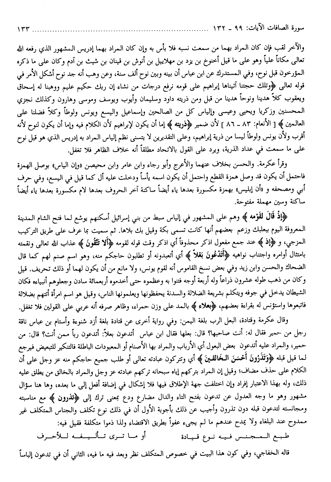 إِذْ قالَ لِقَوْمِهِ وهم على المشهور في إلياس سبط من بني إسرائيل أسكنهم يوشع لما فتح الشام المدينة المعروفة اليوم ببعلبك وزعم بعضهم أنها كانت تسمى بكة وقيل بك بلاها. ثم سميت بما عرف على طريق التركيب المزجي، وإِذْ عند جمع مفعول اذكر محذوفا أي اذكر وقت قوله لقومه أَلا تَتَّقُونَ عذاب الله تعالى ونقمته بامتثال أوامره واجتناب نواهيه أَتَدْعُونَ بَعْلًا أي أتعبدونه أو تطلبون حاجكم منه، وهو اسم صنم لهم كما قال الضحاك والحسن وابن زيد وفي بعض نسخ القاموس أنه لقوم يونس، ولا مانع من أن يكون لهما أو ذلك تحريف. قيل وكان من ذهب طوله عشرون ذراعا وله أربعة أوجه فتنوا به وعظموه حتى أخدموه أربعمائة سادن وجعلوهم أنبياءه فكان الشيطان يدخل في جوفه ويتكلم بشريعة الضلالة والسدنة يحفظونها ويعلمونها الناس، وقيل هو اسم امرأة أتتهم بضلالة فاتبعوها واستؤنس له بقراءة بعضهم، بعلاء بالمد على وزن حمراء، وظاهر صرفه أنه عربي على القولين فلا تغفل.
