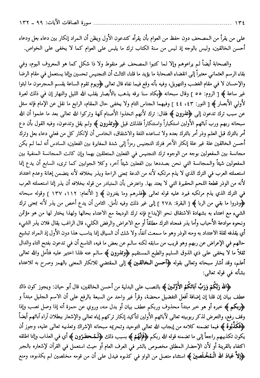 اللَّهَ رَبَّكُمْ وَرَبَّ آبائِكُمُ الْأَوَّلِينَ بالنصب على البدلية من أحسن الخالقين، قال أبو حيان: ويجوز كون ذاك عطف بيان إن قلنا إن إضافة أفعل التفضيل محضة، وقرأ غير واحد من السبعة بالرفع على أن الاسم الجليل مبتدأ ورَبَّكُمْ خبره أو هو خبر مبتدأ محذوف وربكم عطف بيان أو بدل منه، وروي عن حمزة أنه إذا وصل نصب وإذا وقف رفع، والتعرض لذكر ربوبيته تعالى لآبائهم الأولين لتأكيد إنكار تركهم إياه تعالى والإشعار ببطلان آراء آبائهم أيضا فَكَذَّبُوهُ فيما تضمنه كلامه من إيجاب الله تعالى التوحيد وتحريمه سبحانه الإشراك وتعذيبه تعالى عليه، وجوز أن يكون تكذيبهم راجعا إلى ما تضمنه قوله الله ربكم فَإِنَّهُمْ بسبب ذلك لَمُحْضَرُونَ أي في العذاب وإنما أطلقه اكتفاء بالقرينة أو لأن الإحضار المطلق مخصوص بالشر في العرف العام أو حيث استعمل في القرآن لإشعاره بالجبر إِلَّا عِبادَ اللَّهِ الْمُخْلَصِينَ استثناء متصل من الواو في كذبوه فيدل على أن من قومه مخلصين لم يكذبوه، ومنع