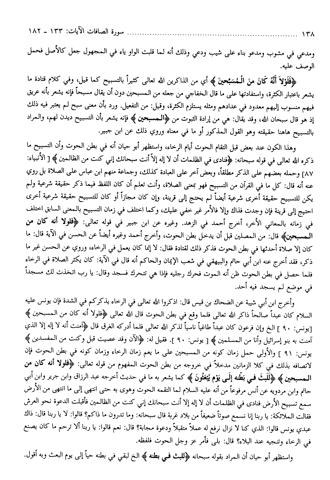 وهذا الكون عند بعض قبل التقام الحوت أيام الرخاء، واستظهر أبو حيان أنه في بطن الحوت وأن التسبيح ما ذكره الله تعالى في قوله سبحانه: فَنادى فِي الظُّلُماتِ أَنْ لا إِلهَ إِلَّا أَنْتَ سُبْحانَكَ إِنِّي كُنْتُ مِنَ الظَّالِمِينَ [الأنبياء: