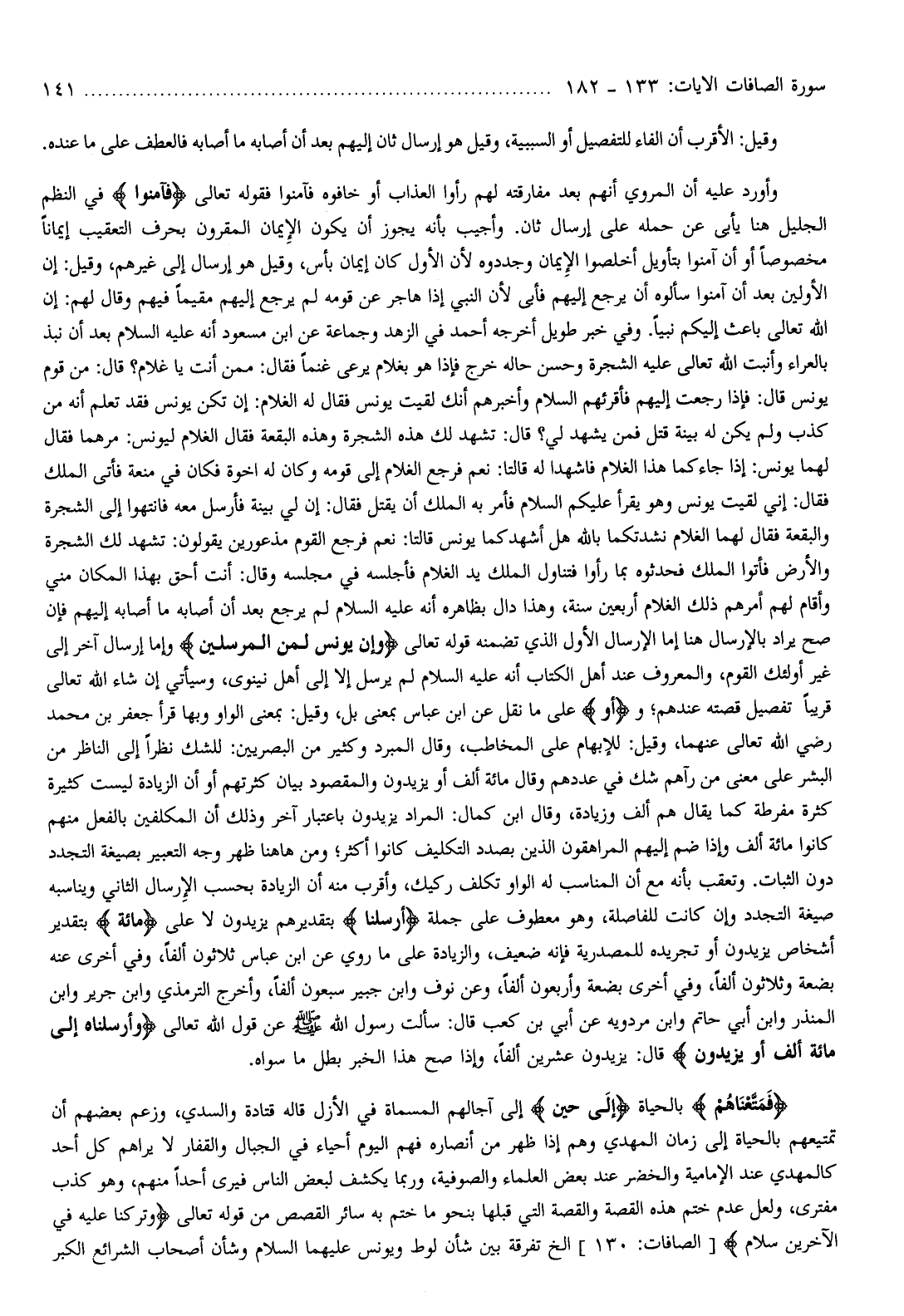 ، وقيل: للإبهام على المخاطب، وقال المبرد وكثير من البصريين: للشك نظرا إلى الناظر من البشر على معنى من رآهم شك في عددهم وقال مائة ألف أو يزيدون والمقصود بيان كثرتهم أو أن الزيادة ليست كثيرة كثرة مفرطة كما يقال هم ألف وزيادة، وقال ابن كمال: المراد يزيدون باعتبار آخر وذلك أن المكلفين بالفعل منهم كانوا مائة ألف وإذا ضم إليهم المراهقون الذين بصدد التكليف كانوا أكثر ومن هاهنا ظهر وجه التعبير بصيغة التجدد دون الثبات. وتعقب بأنه مع أن المناسب له الواو تكلف ركيك، وأقرب منه أن الزيادة بحسب الإرسال الثاني ويناسبه صيغة التجدد وإن كانت للفاصلة، وهو معطوف على جملة أَرْسَلْناهُ بتقديرهم يزيدون لا على مِائَةِ بتقدير أشخاص يزيدون أو تجريده للمصدرية فإنه ضعيف، والزيادة على ما روي عن ابن عباس ثلاثون ألفا، وفي أخرى عنه بضعة وثلاثون ألفا، وفي أخرى بضعة وأربعون ألفا، وعن نوف وابن جبير سبعون ألفا،