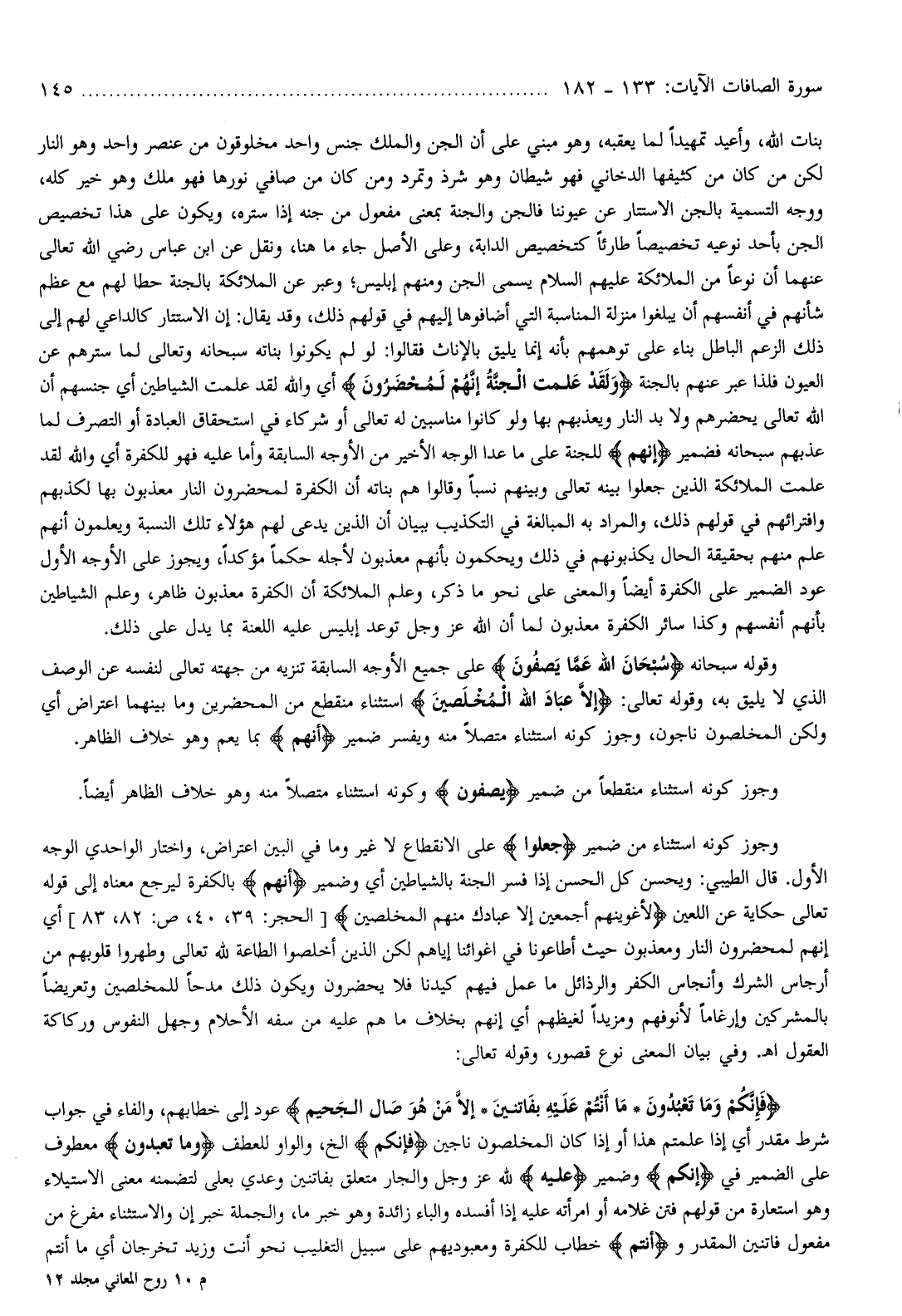 وجوز كونه استثناء من ضمير جَعَلُوا على الانقطاع لا غير وما في البين اعتراض، واختار الواحدي الوجه الأول. قال الطيبي: ويحسن كل الحسن إذا فسر الجنة بالشياطين أي وضمير إِنَّهُمْ بالكفرة ليرجع معناه إلى قوله تعالى حكاية عن اللعين لَأُغْوِيَنَّهُمْ أَجْمَعِينَ إِلَّا عِبادَكَ مِنْهُمُ الْمُخْلَصِينَ [الحجر: 39، 40، ص: 82، 83] أي إنهم لمحضرون النار ومعذبون حيث أطاعونا في اغوائنا إياهم لكن الذين أخلصوا الطاعة لله تعالى وطهروا قلوبهم من أرجاس الشرك وأنجاس الكفر والرذائل ما عمل فيهم كيدنا فلا يحضرون ويكون ذلك مدحا للمخلصين وتعريضا بالمشركين وإرغاما لأنوفهم ومزيدا لغيظهم أي إنهم بخلاف ما هم عليه من سفه الأحلام وجهل النفوس وركاكة العقول اه. وفي بيان المعنى نوع قصور، وقوله تعالى: