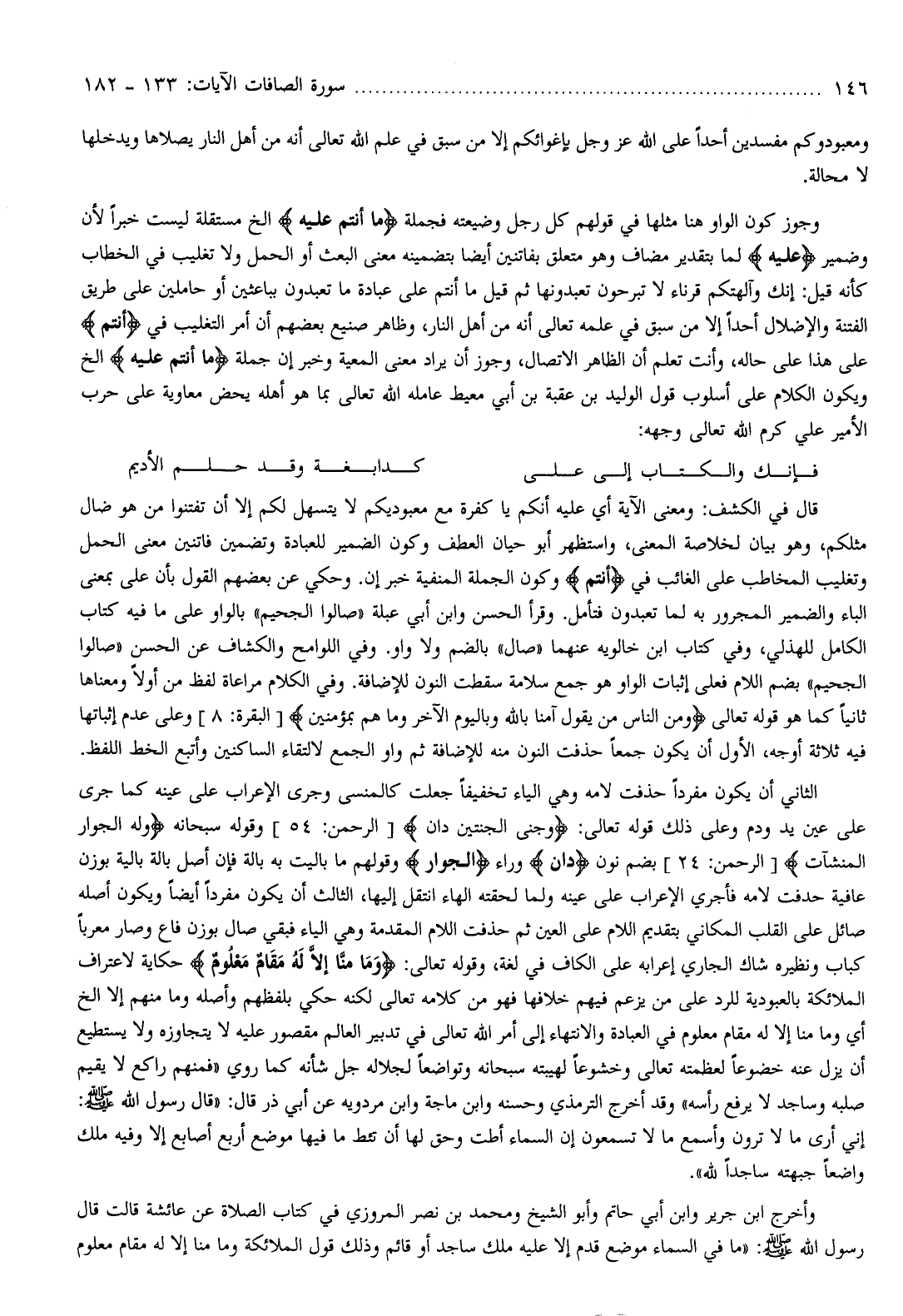 الثاني أن يكون مفردا حذفت لامه وهي الياء تخفيفا جعلت كالمنسى وجرى الإعراب على عينه كما جرى على عين يد ودم وعلى ذلك قوله تعالى: وَجَنَى الْجَنَّتَيْنِ دانٍ [الرحمن: 54] وقوله سبحانه وَلَهُ الْجَوارِ الْمُنْشَآتُ [الرحمن: 24] بضم نون دان وراء الجوار وقولهم ما باليت به بالة فإن أصل بالة بالية بوزن عافية حدفت لامه فأجري الإعراب على عينه ولما لحقته الهاء انتقل إليها، الثالث أن يكون مفردا أيضا ويكون أصله صائل على القلب المكاني بتقديم اللام على العين ثم حذفت اللام المقدمة وهي الياء فبقي صال بوزن فاع وصار معربا كباب ونظيره شاك الجاري إعرابه على الكاف في لغة، وقوله تعالى وَما مِنَّا إِلَّا لَهُ مَقامٌ مَعْلُومٌ حكاية لاعتراف الملائكة بالعبودية للرد على من يزعم فيهم خلافها فهو من كلامه تعالى لكنه حكي بلفظهم وأصله وما منهم إلا إلخ أي وما منا إلا له مقام معلوم في العبادة والانتهاء إلى أمر الله تعالى في تدبير العالم مقصور عليه لا يتجاوزه ولا يستطيع أن يزل عنه خضوعا لعظمته تعالى وخشوعا لهيبته سبحانه وتواضعا لجلاله جل شأنه كما