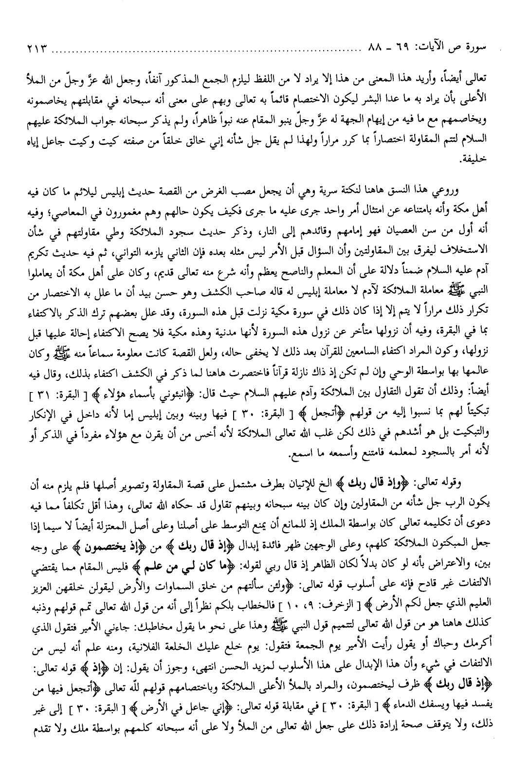 إِذْ قالَ رَبُّكَ ظرف ليختصمون، والمراد بالملأ الأعلى الملائكة وباختصامهم قولهم لله تعالى أَتَجْعَلُ فِيها مَنْ يُفْسِدُ فِيها وَيَسْفِكُ الدِّماءَ [البقرة: 30] في مقابلة قوله تعالى: إِنِّي جاعِلٌ فِي الْأَرْضِ [البقرة: 30] إلى غير ذلك، ولا يتوقف صحة إرادة ذلك على جعل الله تعالى من الملأ ولا على أنه سبحانه كلمهم بواسطة ملك ولا تقدم