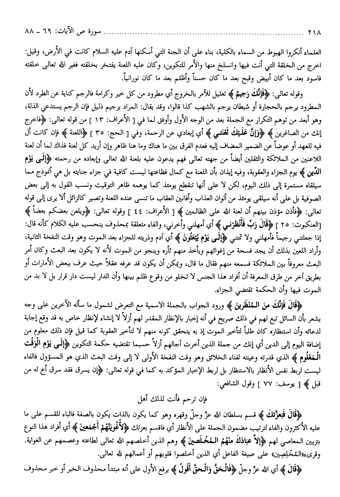 وقوله تعالى: فَإِنَّكَ رَجِيمٌ تعليل للأمر بالخروج أي مطرود من كل خير وكرامة فالرجم كناية عن الطرد لأن المطرود يرجم بالحجارة أو شيطان يرجم بالشهب كذا قالوا، وقد يقال: المراد برجيم ذليل فإن الرجم يستدعي الذلة، وهو أبعد من توهم التكرار مع الجملة بعد من الوجه الأول وأوفق لما في [الأعراف: 13] من قوله تعالى: فَاخْرُجْ إِنَّكَ مِنَ الصَّاغِرِينَ وَإِنَّ عَلَيْكَ لَعْنَتِي أي إبعادي عن الرحمة، وفي [الحجر: 35] اللَّعْنَةَ فإن كانت أل فيه للعهد أو عوضا عن الضمير المضاف إليه فعدم الفرق بين ما هناك وما هنا ظاهر وإن أريد كل لعنة فذاك لما أن لعنة اللاعنين من الملائكة والثقلين أيضا من جهته تعالى فهم يدعون عليه بلعنة الله تعالى وإبعاده من رحمته إِلى يَوْمِ الدِّينِ يوم الجزاء والعقوبة، وفيه إيذان بأن اللعنة مع كمال فظاعتها ليست كافية في جزاء جنايته بل هي أنموذج مما سيلقاه مستمرة إلى ذلك اليوم، لكن لا على أنها تنقطع يومئذ كما يوهمه ظاهر التوقيت ونسب القول به إلى بعض الصوفية بل على أنه سيلقى يومئذ من ألوان العذاب وأفانين العقاب ما تنسى عنده اللعنة وتصير كالزائل ألا يرى إلى قوله تعالى: فَأَذَّنَ مُؤَذِّنٌ بَيْنَهُمْ أَنْ لَعْنَةُ اللَّهِ عَلَى الظَّالِمِينَ [الأعراف: 44] وقوله تعالى: وَيَلْعَنُ بَعْضُكُمْ بَعْضاً [العنكبوت: 25] قالَ رَبِّ فَأَنْظِرْنِي أي أمهلني وأخرني، والفاء متعلقة بمحذوف ينحسب عليه الكلام كأنه قال: