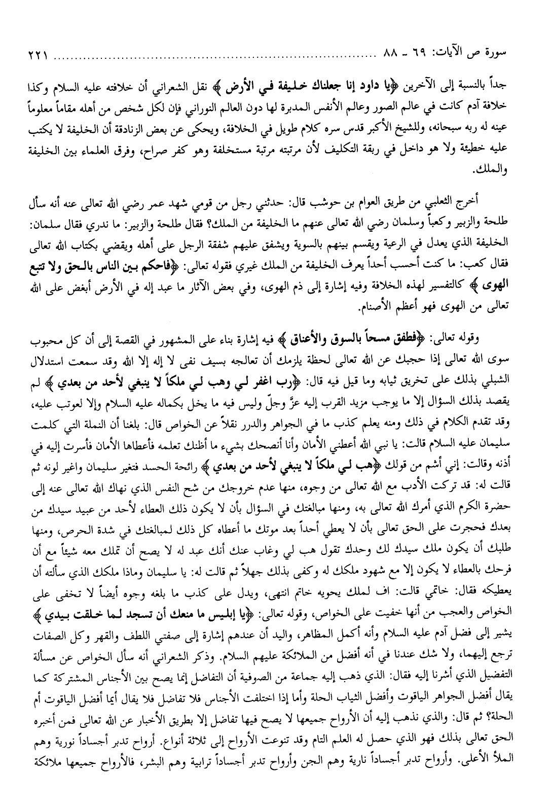 جدا بالنسبة إلى الآخرين يا داوُدُ إِنَّا جَعَلْناكَ خَلِيفَةً فِي الْأَرْضِ نقل الشعراني أن خلافته عليه السلام وكذا خلافة آدم كانت في عالم الصور وعالم الأنفس المدبرة لها دون العالم النوراني فإن لكل شخص من أهله مقاما معلوما عينه له ربه سبحانه، وللشيخ الأكبر قدس سره كلام طويل في الخلافة، ويحكى عن بعض الزنادقة أن الخليفة لا يكتب عليه خطيئة ولا هو داخل في ربقة التكليف لأن مرتبته مرتبة مستخلفة وهو كفر صراح، وفرق العلماء بين الخليفة والملك.