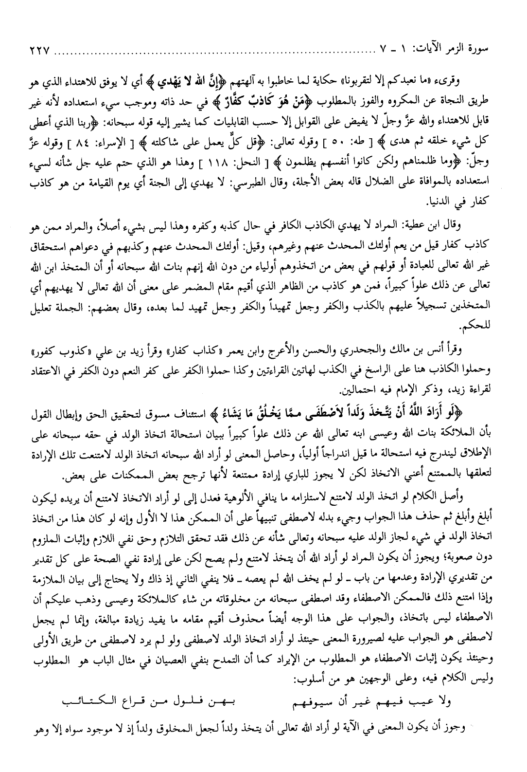 لَوْ أَرادَ اللَّهُ أَنْ يَتَّخِذَ وَلَداً لَاصْطَفى مِمَّا يَخْلُقُ ما يَشاءُ استئناف مسوق لتحقيق الحق وإبطال القول بأن الملائكة بنات الله وعيسى ابنه تعالى الله عن ذلك علوا كبيرا ببيان استحالة اتخاذ الولد في حقه سبحانه على الإطلاق ليندرج فيه استحالة ما قيل اندراجا أوليا، وحاصل المعنى لو أراد الله سبحانه اتخاذ الولد لا متنعت تلك الإرادة لتعلقها بالممتنع أعني الاتخاذ لكن لا يجوز للباري إرادة ممتنعة لأنها ترجح بعض الممكنات على بعض.