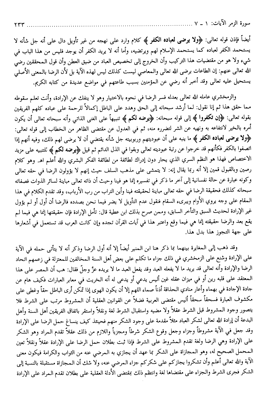 أيضا فإذن قوله تعالى: وَلا يَرْضى لِعِبادِهِ الْكُفْرَ كلام وارد على نهجه من غير تأويل دال على أنه جل شأنه لا يستحمد الكفر لعباده كما يستحمد الإسلام لهم ويرتضيه، وأما أنه لا يريد الكفر أن يوجد فليس من هذا الباب في شيء ولا هو من مقتضيات هذا التركيب وأن الخروج إلى تخصيص العباد من ضيق العطن وأن قول المحققين رضي الله تعالى عنهم: إن الطاعات برضى الله تعالى والمعاصي ليست كذلك ليس لهذه الآية بل لأن الرضا بالمعنى الأصلي يستحيل عليه تعالى وقد أخبر أنه رضي عن المؤمنين بسبب طاعتهم في مواضع عديدة من كتابه الكريم.