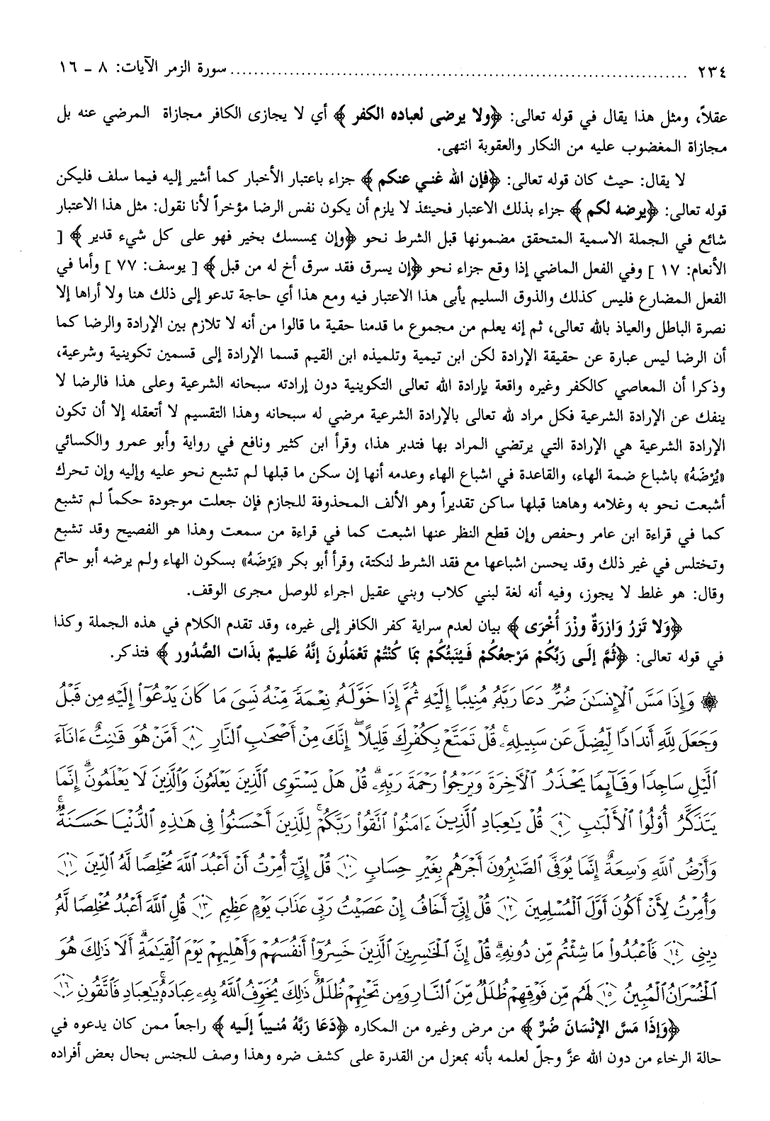 لا يقال: حيث كان قوله تعالى: فَإِنَّ اللَّهَ غَنِيٌّ عَنْكُمْ جزاء باعتبار الأخبار كما أشير إليه فيما سلف فليكن قوله تعالى: يَرْضَهُ لَكُمْ جزاء بذلك الاعتبار فحينئذ لا يلزم أن يكون نفس الرضا مؤخرا لأنا نقول: مثل هذا الاعتبار شائع في الجملة الاسمية المتحقق مضمونها قبل الشرط نحو وَإِنْ يَمْسَسْكَ بِخَيْرٍ فَهُوَ عَلى كُلِّ شَيْءٍ قَدِيرٌ [الأنعام: 17] وفي الفعل الماضي إذا وقع جزاء نحو إِنْ يَسْرِقْ فَقَدْ سَرَقَ أَخٌ لَهُ مِنْ قَبْلُ [يوسف: 77] وأما في الفعل المضارع فليس كذلك والذوق السليم يأبى هذا الاعتبار فيه ومع هذا أي حاجة تدعو إلى ذلك هنا ولا أراها إلا نصرة الباطل والعياذ بالله تعالى، ثم إنه يعلم من مجموع ما قدمنا حقية ما قالوا من أنه لا تلازم بين الإرادة والرضا كما أن الرضا ليس عبارة عن حقيقة الإرادة لكن ابن تيمية وتلميذه ابن القيم قسما الإرادة إلى قسمين تكوينية وشرعية، وذكرا أن المعاصي كالكفر وغيره واقعة بإرادة الله تعالى التكوينية دون إرادته سبحانه الشرعية وعلى هذا فالرضا لا ينفك عن الإرادة الشرعية فكل مراد لله تعالى بالإرادة الشرعية مرضي له سبحانه وهذا التقسيم لا أتعقله إلا أن تكون الإرادة الشرعية هي الإرادة التي يرتضي المراد بها فتدبر هذا، وقرأ ابن كثير ونافع في رواية وأبو عمرو والكسائي «يرضه» بإشباع ضمة الهاء، والقاعدة في إشباع الهاء وعدمه أنها إن سكن ما قبلها لم تشبع نحو عليه وإليه وإن تحرك أشبعت نحو به وغلامه وهاهنا قبلها ساكن تقديرا وهو الألف المحذوفة للجازم فإن جعلت موجودة حكما لم تشبع كما في قراءة ابن عامر وحفص وإن قطع النظر عنها أشبعت كما في قراءة من سمعت وهذا هو الفصيح وقد تشبع وتختلس في غير ذلك وقد يحسن اشباعها مع فقد الشرط لنكتة، وقرأ أبو بكر «يرضه» بسكون الهاء ولم يرضه أبو حاتم وقال: هو غلط لا يجوز، وفيه أنه لغة لبني كلاب وبني عقيل اجراء للوصل مجرى الوقف.