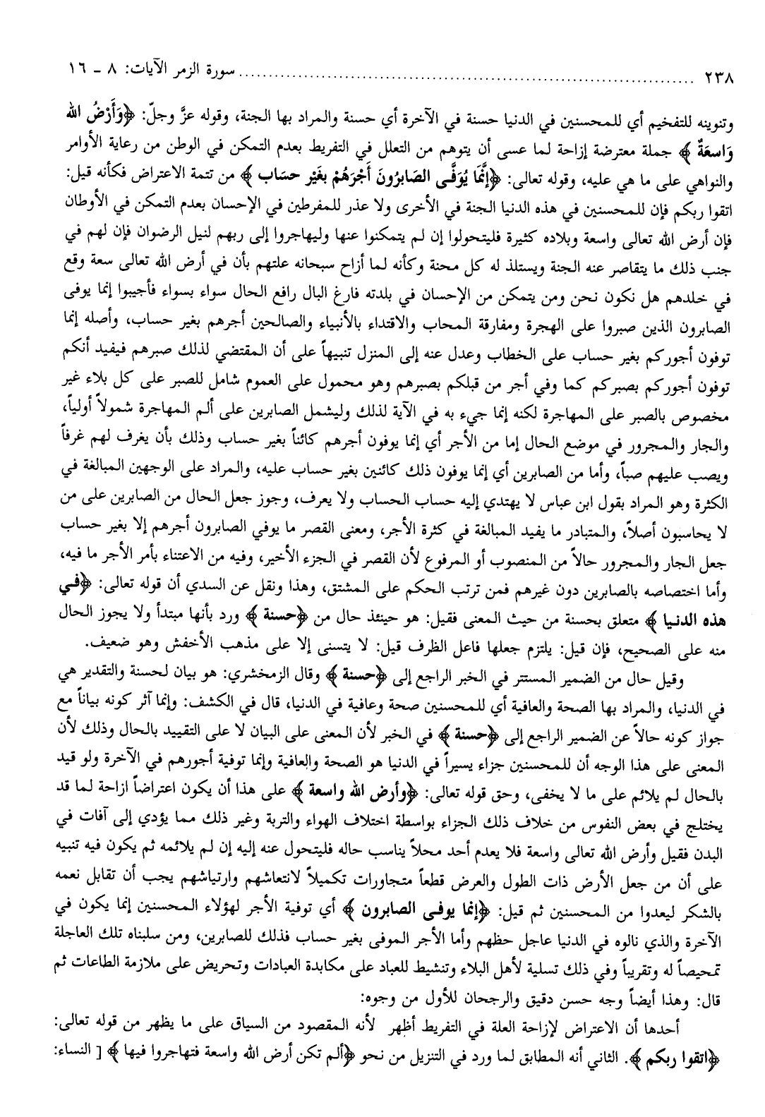 اتقوا ربكم فإن للمحسنين في هذه الدنيا الجنة في الأخرى ولا عذر للمفرطين في الإحسان بعدم التمكن في الأوطان فإن أرض الله تعالى واسعة وبلاده كثيرة فليتحولوا إن لم يتمكنوا عنها وليهاجروا إلى ربهم لنيل الرضوان فإن لهم في جنب ذلك ما يتقاصر عنه الجنة ويستلذ له كل محنة وكأنه لما أزاح سبحانه علتهم بأن في أرض الله تعالى سعة وقع في خلدهم هل نكون نحن ومن يتمكن من الإحسان في بلدته فارغ البال رافع الحال سواء بسواء فأجيبوا إنما يوفى الصابرون الذين صبروا على الهجرة ومفارقة المحاب والاقتداء بالأنبياء والصالحين أجرهم بغير حساب، وأصله إنما توفون أجوركم بغير حساب على الخطاب وعدل عنه إلى المنزل تنبيها على أن المقتضي لذلك صبرهم فيفيد أنكم توفون أجوركم بصبركم كما وفي أجر من قبلكم بصبرهم وهو محمول على العموم شامل للصبر على كل بلاء غير مخصوص بالصبر على المهاجرة لكنه إنما جيء به في الآية لذلك وليشمل الصابرين على ألم المهاجرة شمولا أوليا، والجار والمجرور في موضع الحال إما من الأجر أي إنما يوفون أجرهم كائنا بغير حساب وذلك بأن يغرف لهم غرفا ويصب عليهم صبا، وأما من الصابرين أي إنما يوفون ذلك كائنين بغير حساب عليه، والمراد على الوجهين المبالغة في الكثرة وهو المراد بقول ابن عباس لا يهتدي إليه حساب الحساب ولا يعرف، وجوز جعل الحال من الصابرين على من لا يحاسبون أصلا، والمتبادر ما يفيد المبالغة في كثرة الأجر، ومعنى القصر ما يوفي الصابرون أجرهم إلا بغير حساب جعل الجار والمجرور حالا من المنصوب أو المرفوع لأن القصر في الجزء الأخير، وفيه من الاعتناء بأمر الأجر ما فيه، وأما اختصاصه بالصابرين دون غيرهم فمن ترتب الحكم على المشتق، وهذا ونقل عن السدي أن قوله تعالى: فِي هذِهِ الدُّنْيا متعلق بحسنة من حيث المعنى فقيل: هو حينئذ حال من حَسَنَةٌ ورد بأنها مبتدأ ولا يجوز الحال منه على الصحيح، فإن قيل: يلتزم جعلها فاعل الظرف قيل: لا يتسنى إلا على مذهب الأخفش وهو ضعيف.