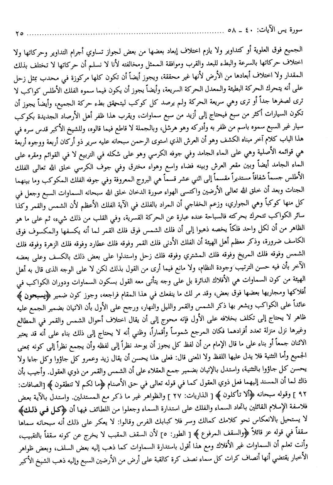 الجميع فوق العلوية أو كتداوير ولا يلزم اختلاف إبعاد بعضها من بعض لجواز تساوي أجرام التداوير وحركاتها ولا اختلاف حركاتها بالسرعة والبطء للبعد والقرب وموافقة الممثل ومخالفته لأنا لا نسلم أن حركاتها لا تختلف بذلك المقدار ولا اختلاف أبعادها من الأرض لأنها غير محققة، ويجوز أيضا أن تكون كلها مركوزة في محدب بمثل زحل على أنه يتحرك الحركة البطيئة والمعدل الحركة السريعة، وأيضا يجوز أن يكون فيما سموه الفلك الأطلس كواكب لا ترى لصغرها جدا أو ترى وهي سريعة الحركة ولم يرصد كل كوكب ليتحقق بطء حركة الجميع، وأيضا يجوز أن تكون السيارات أكثر من سبع فيحتاج إلى أزيد من سبع سماوات، ويقرب هذا ظفر أهل الأرصاد الجديدة بكوكب سيار غير السبع سموه باسم من ظفر به وأدركه وهو هرشل، وبالجملة لا قاطع فيما قالوه، وللشيخ الأكبر قدس سره في هذا الباب كلام آخر مبناه الكشف وهو أن العرش الذي استوى الرحمن سبحانه عليه سرير ذو أركان أربعة ووجوه أربعة هي قوائمه الأصلية وهي على الماء الجامد وفي جوفه الكرسي وهو على شكله في التربيع لا في القوائم ومقره على الماء الجامد أيضا وبين مقعر العرش وبينه فضاء واسع وهواء مخترق وفي جوف الكرسي خلق الله تعالى الفلك الأطلس جسما شفافا مستديرا مقسما إلى اثني عشر قسما هي البروج المعروفة وفي جوفه الفلك المكوكب وما بينهما الجنات وبعد أن خلق الله تعالى الأرضين واكتسى الهواء صورة الدخان خلق الله سبحانه السماوات السبع وجعل في كل منها كوكبا وهي الجواري، وزعم الخفاجي أن المراد بالفلك في الآية الفلك الأعظم لأن الشمس والقمر وكذا سائر الكواكب تتحرك بحركته فالسباحة عنده عبارة عن الحركة القسرية، وفي القلب من ذلك شيء، ثم على ما هو الظاهر من أن لكل واحد فلكا يخصه ذهبوا إلى أن فلك الشمس فوق فلك القمر لما أنه يكسفها والمكسوف فوق الكاسف ضرورة، وذكر معظم أهل الهيئة أن الفلك الأدنى فلك القمر وفوقه فلك عطارد وفوقه فلك الزهرة وفوقه فلك الشمس وفوقه فلك المريخ