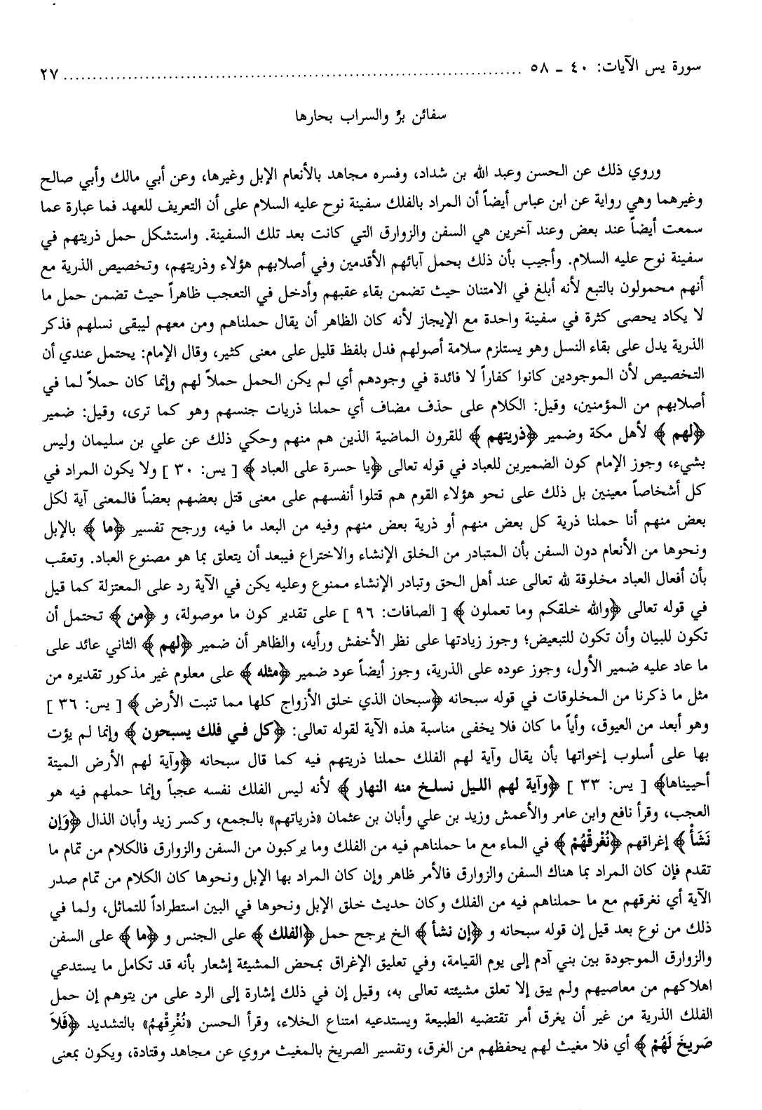 سفائن برّ والسراب بحارها وروي ذلك عن الحسن وعبد الله بن شداد، وفسره مجاهد بالأنعام الإبل وغيرها، وعن أبي مالك وأبي صالح وغيرهما وهي رواية عن ابن عباس أيضا أن المراد بالفلك سفينة نوح عليه السلام على أن التعريف للعهد فما عبارة عما سمعت أيضا عند بعض وعند آخرين هي السفن والزوارق التي كانت بعد تلك السفينة. واستشكل حمل ذريتهم في سفينة نوح عليه السلام. وأجيب بأن ذلك بحمل آبائهم الأقدمين وفي أصلابهم هؤلاء وذريتهم، وتخصيص الذرية مع أنهم محمولون بالتبع لأنه أبلغ في الامتنان حيث تضمن بقاء عقبهم وأدخل في التعجب ظاهرا حيث تضمن حمل ما لا يكاد يحصى كثرة في سفينة واحدة مع الإيجاز لأنه كان الظاهر أن يقال حملناهم ومن معهم ليبقى نسلهم فذكر الذرية يدل على بقاء النسل وهو يستلزم سلامة أصولهم فدل بلفظ قليل على معنى كثير، وقال الإمام: يحتمل عندي أن التخصيص لأن الموجودين كانوا كفارا لا فائدة في وجودهم أي لم يكن الحمل حملا لهم وإنما كان حملا لما في أصلابهم من المؤمنين، وقيل: الكلام على حذف مضاف أي حملنا ذريات جنسهم وهو كما ترى، وقيل: ضمير لَهُمْ لأهل مكة وضمير ذُرِّيَّتَهُمْ للقرون الماضية الذين هم منهم وحكي ذلك عن علي بن سليمان وليس بشيء، وجوز الإمام كون الضميرين للعباد في قوله تعالى يا حَسْرَةً عَلَى الْعِبادِ [يس: 30] ولا يكون المراد في كل أشخاصا معينين بل ذلك على نحو هؤلاء القوم هم قتلوا أنفسهم على معنى قتل بعضهم بعضا فالمعنى آية لكل بعض منهم أنا حملنا ذرية كل بعض منهم أو ذرية بعض منهم وفيه من البعد ما فيه، ورجح تفسير ما بالإبل ونحوها من الأنعام دون السفن بأن المتبادر من الخلق الإنشاء والاختراع فيبعد أن يتعلق بما هو مصنوع العباد. وتعقب بأن أفعال العباد مخلوقة لله تعالى عند أهل الحق وتبادر الإنشاء ممنوع وعليه يكن في الآية رد على المعتزلة كما قيل في قوله تعالى وَاللَّهُ خَلَقَكُمْ وَما تَعْمَلُونَ [الصافات: 96] على تقدير كون ما موصولة، ومِنْ تحتمل أن تكون للبيان وأن تكون للتبعيض وجوز زيادتها على نظر الأخفش ورأيه، والظاهر أن ضمير لَهُمْ الثاني عائد على ما عاد عليه ضمير الأول، وجوز عوده على الذرية، وجوز أيضا عود ضمير مِثْلِهِ على معلوم غير مذكور تقديره من مثل ما ذكرنا من المخلوقات في قوله سبحانه سُبْحانَ الَّذِي خَلَقَ الْأَزْواجَ كُلَّها مِمَّا تُنْبِتُ الْأَرْضُ [يس: 36] وهو أبعد من العيوق، وأيا ما كان فلا يخفى مناسبة هذه الآية لقوله تعالى: كُلٌّ فِي فَلَكٍ يَسْبَحُونَ وإنما لم يؤت بها على أسلوب أخواتها بأن يقال وآية لهم الفلك حملنا ذريتهم فيه كما قال سبحانه وَآيَةٌ لَهُمُ الْأَرْضُ الْمَيْتَةُ أَحْيَيْناها [يس: 33] وَآيَةٌ لَهُمُ اللَّيْلُ نَسْلَخُ مِنْهُ النَّهارَ لأنه ليس الفلك نفسه عجبا وإنما حملهم فيه هو العجب، وقرأ نافع وابن عامر والأعمش وزيد بن علي وأبان بن عثمان «ذرياتهم» بالجمع، وكسر زيد وأبان الذال وَإِنْ نَشَأْ إغراقهم نُغْرِقْهُمْ في الماء مع ما حملناهم فيه من الفلك وما يركبون من السفن والزوارق فالكلام من تمام ما تقدم فإن كان المراد بما هناك السفن والزوارق فالأمر ظاهر وإن كان المراد بها الإبل ونحوها كان الكلام من تمام صدر الآية أي نغرقهم مع ما حملنا هم فيه من الفلك وكان حديث خلق الإبل ونحوها في البين استطرادا للتماثل، ولما في ذلك من نوع بعد قيل إن قوله سبحانه وإِنْ نَشَأْ إلخ يرجح حمل الْفُلْكِ على الجنس وما على السفن والزوارق الموجودة بين بني آدم إلى يوم القيامة، وفي تعليق الإغراق بمحض المشيئة إشعار بأنه قد تكامل ما يستدعي إهلاكهم من معاصيهم ولم يبق إلا تعلق مشيئته تعالى به، وقيل إن في ذلك إشارة إلى الرد على من يتوهم إن حمل الفلك الذرية من غير أن يغرق أمر تقتضيه الطبيعة ويستدعيه امتناع الخلاء، وقرأ الحسن «نغرقهم» بالتشديد فَلا صَرِيخَ لَهُمْ أي فلا مغيث لهم يحفظهم من الغرق، وتفسير الصريخ بالمغيث مروي عن مجاهد وقتادة، ويكون بمعنى