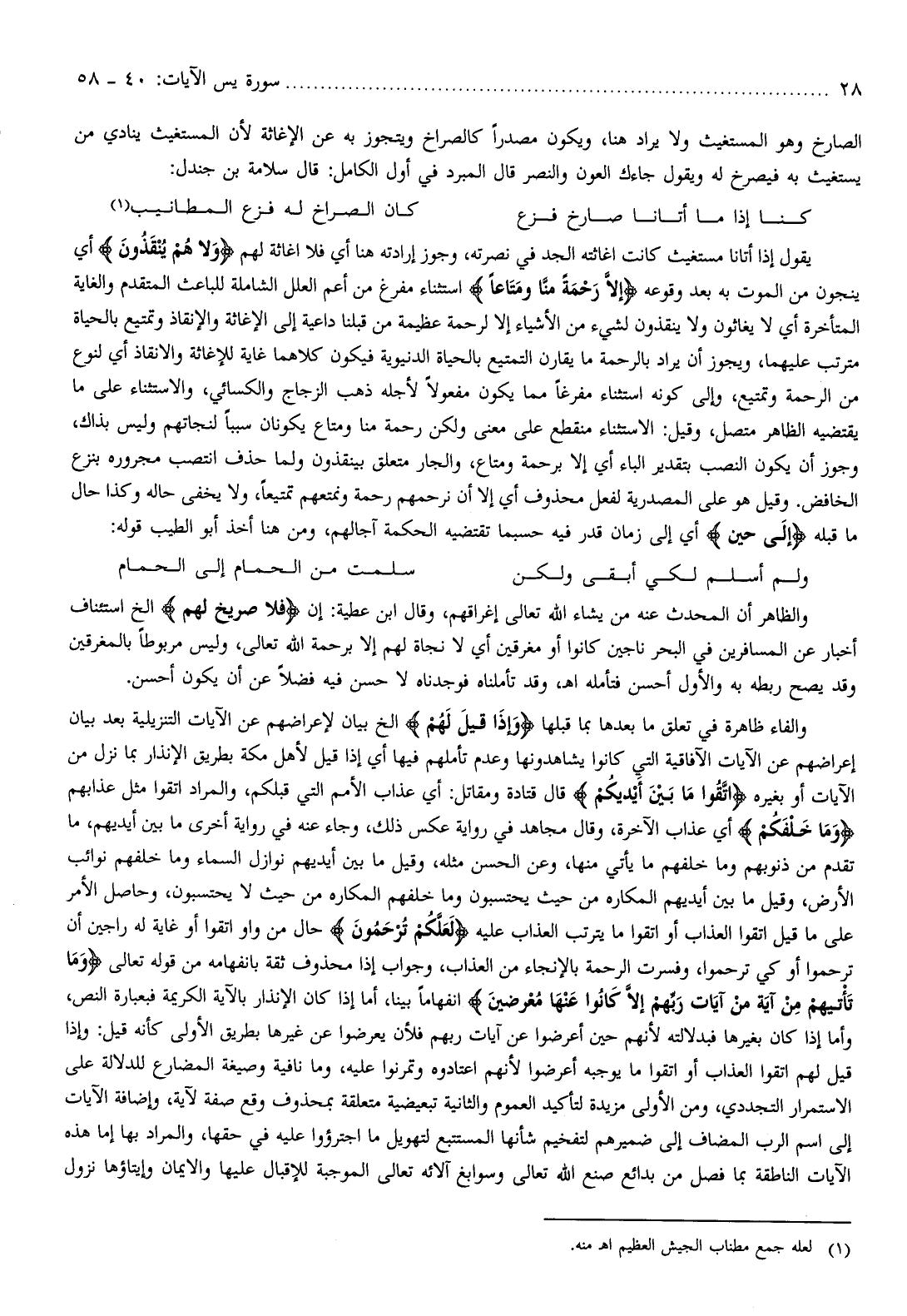 يقول إذا أتانا مستغيث كانت اغاثته الجد في نصرته، وجوز إرادته هنا أي فلا اغاثة لهم وَلا هُمْ يُنْقَذُونَ أي ينجون من الموت به بعد وقوعه إِلَّا رَحْمَةً مِنَّا وَمَتاعاً استثناء مفرغ من أعم العلل الشاملة للباعث المتقدم والغاية المتأخرة أي لا يغاثون ولا ينقذون لشيء من الأشياء إلا لرحمة عظيمة من قبلنا داعية إلى الإغاثة والإنقاذ وتمتيع بالحياة مترتب عليهما، ويجوز أن يراد بالرحمة ما يقارن التمتيع بالحياة الدنيوية فيكون كلاهما غاية للإغاثة والانقاذ أي لنوع من الرحمة وتمتيع، وإلى كونه استثناء مفرغا مما يكون مفعولا لأجله ذهب الزجاج والكسائي، والاستثناء على ما يقتضيه الظاهر متصل، وقيل: الاستثناء منقطع على معنى ولكن رحمة منا ومتاع يكونان سببا لنجاتهم وليس بذاك، وجوز أن يكون النصب بتقدير الباء أي إلا برحمة ومتاع، والجار متعلق بينقذون ولما حذف انتصب مجروره بنزع الخافض. وقيل هو على المصدرية لفعل محذوف أي إلا أن نرحمهم رحمة ونمتعهم تمتيعا، ولا يخفى حاله وكذا حال ما قبله إِلى حِينٍ أي إلى زمان قدر فيه حسبما تقتضيه الحكمة آجالهم، ومن هنا أخذ أبو الطيب قوله: