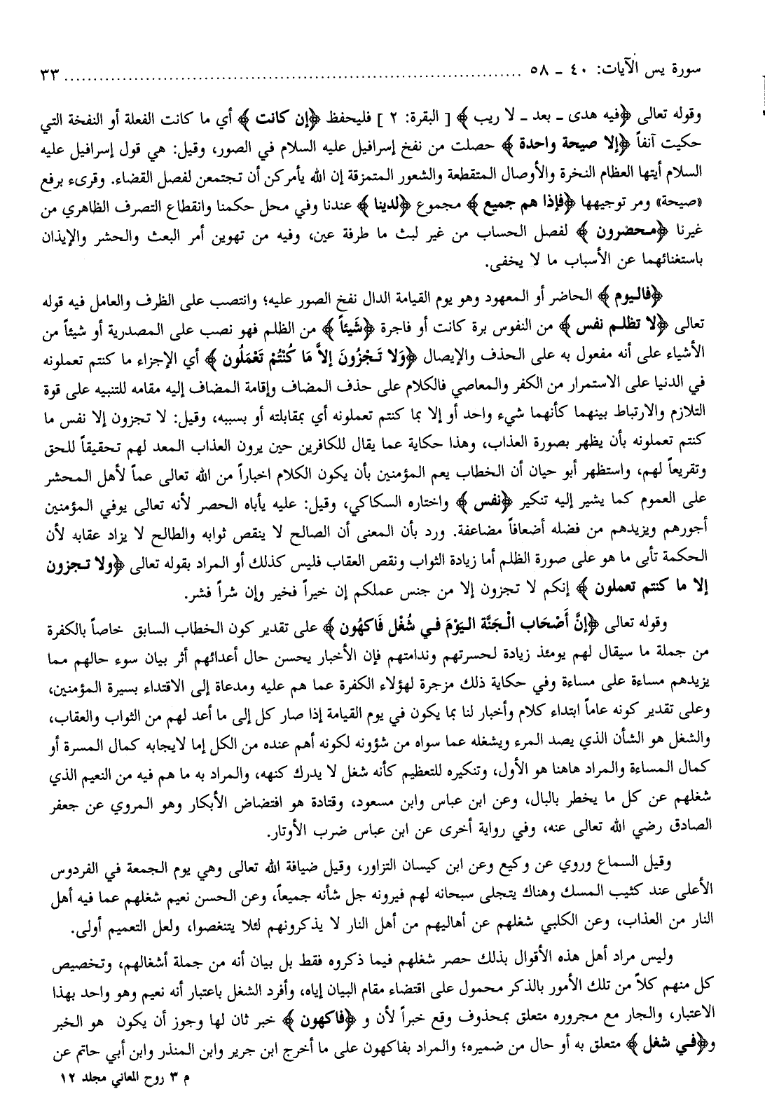 وليس مراد أهل هذه الأقوال بذلك حصر شغلهم فيما ذكروه فقط بل بيان أنه من جملة أشغالهم، وتخصيص كل منهم كلا من تلك الأمور بالذكر محمول على اقتضاء مقام البيان إياه، وأفرد الشغل باعتبار أنه نعيم وهو واحد بهذا الاعتبار، والجار مع مجروره متعلق بمحذوف وقع خبرا لأن وفاكِهُونَ خبر ثان لها وجوز أن يكون هو الخبر وفِي شُغُلٍ متعلق به أو حال من ضميره والمراد بفاكهون على ما أخرج ابن جرير وابن المنذر وابن أبي حاتم عن