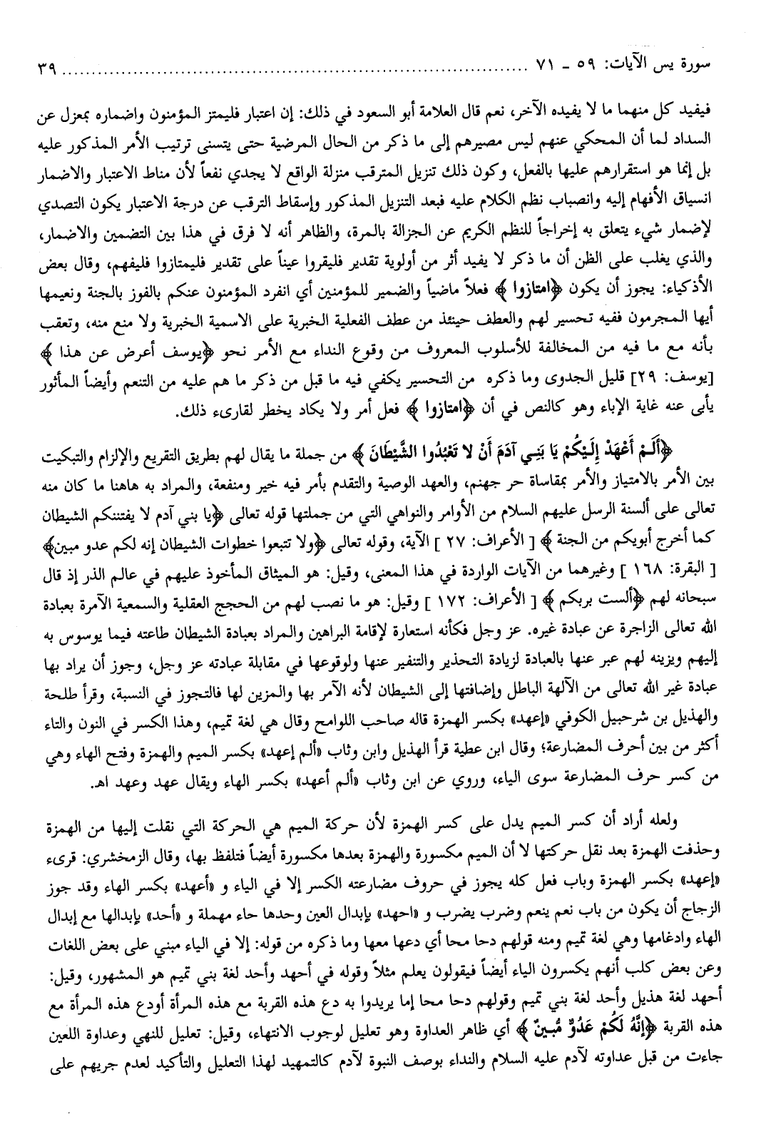 أَلَمْ أَعْهَدْ إِلَيْكُمْ يا بَنِي آدَمَ أَنْ لا تَعْبُدُوا الشَّيْطانَ من جملة ما يقال لهم بطريق التقريع والإلزام والتبكيت بين الأمر بالامتياز والأمر بمقاساة حر جهنم، والعهد الوصية والتقدم بأمر فيه خير ومنفعة، والمراد به هاهنا ما كان منه تعالى على ألسنة الرسل عليهم السلام من الأوامر والنواهي التي من جملتها قوله تعالى يا بَنِي آدَمَ لا يَفْتِنَنَّكُمُ الشَّيْطانُ كَما أَخْرَجَ أَبَوَيْكُمْ مِنَ الْجَنَّةِ [الأعراف: 27] الآية، وقوله تعالى وَلا تَتَّبِعُوا خُطُواتِ الشَّيْطانِ إِنَّهُ لَكُمْ عَدُوٌّ مُبِينٌ [البقرة: 168] وغيرهما من الآيات الواردة في هذا المعنى، وقيل: هو الميثاق المأخوذ عليهم في عالم الذر إذ قال سبحانه لهم أَلَسْتُ بِرَبِّكُمْ [الأعراف: 172] وقيل: هو ما نصب لهم من الحجج العقلية والسمعية الآمرة بعبادة الله تعالى الزاجرة عن عبادة غيره. عز وجل فكأنه استعارة لإقامة البراهين والمراد بعبادة الشيطان طاعته فيما يوسوس به إليهم ويزينه لهم عبر عنها بالعبادة لزيادة التحذير والتنفير عنها ولوقوعها في مقابلة عبادته عز وجل، وجوز أن يراد بها عبادة غير الله تعالى من الآلهة الباطل وإضافتها إلى الشيطان لأنه الآمر بها والمزين لها فالتجوز في النسبة، وقرأ طلحة والهذيل بن شرحبيل الكوفي «اعهد» بكسر الهمزة قاله صاحب اللوامح وقال هي لغة تميم، وهذا الكسر في النون والتاء أكثر من بين أحرف المضارعة وقال ابن عطية قرأ الهذيل وابن وثاب «ألم اعهد» بكسر الميم والهمزة وفتح الهاء وهي من كسر حرف المضارعة سوى الياء، وروي عن ابن وثاب «ألم أعهد» بكسر الهاء ويقال عهد وعهد اه.