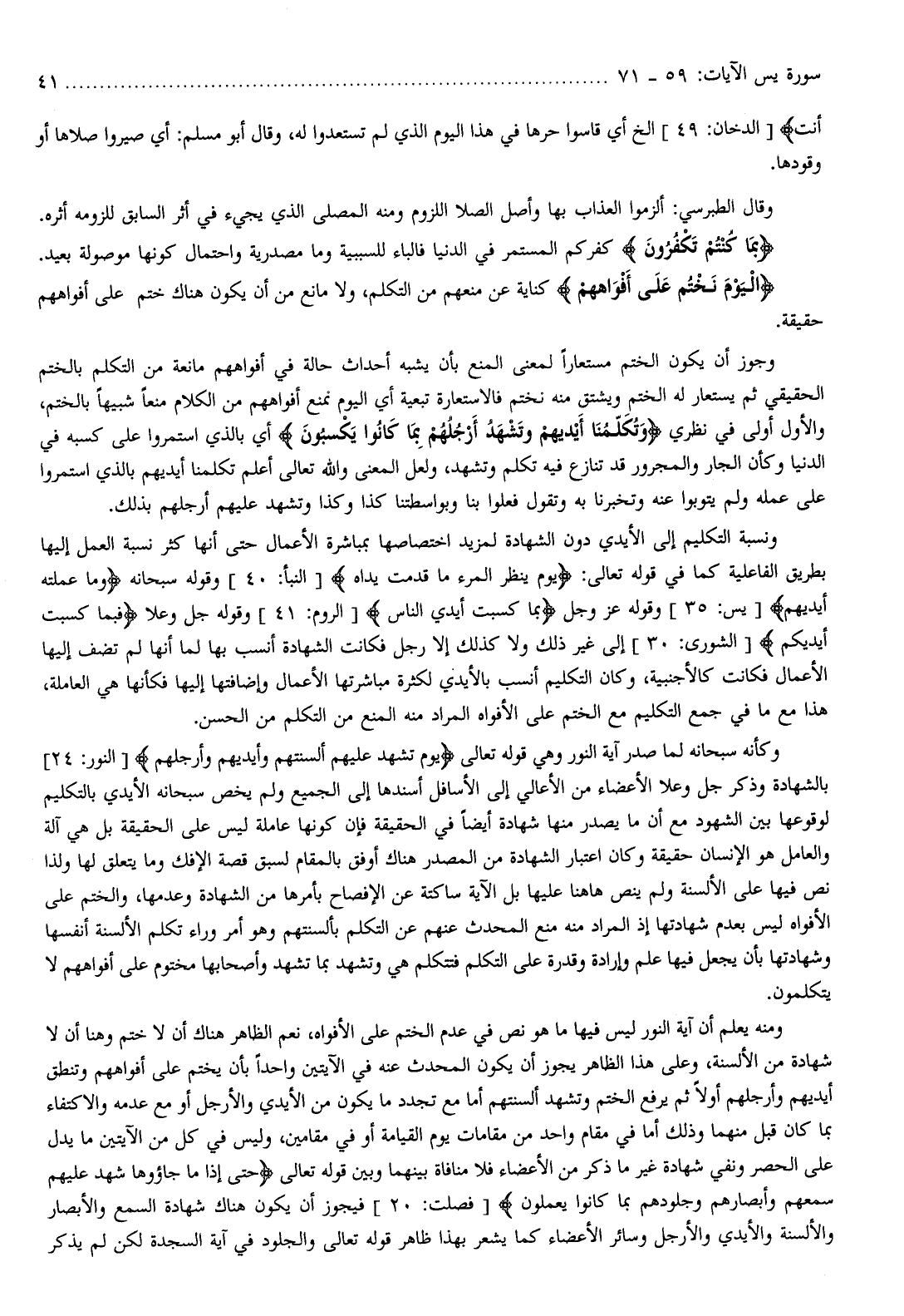 ومنه يعلم أن آية النور ليس فيها ما هو نص في عدم الختم على الأفواه، نعم الظاهر هناك أن لا ختم وهنا أن لا شهادة من الألسنة، وعلى هذا الظاهر يجوز أن يكون المحدث عنه في الآيتين واحدا بأن يختم على أفواههم وتنطق أيديهم وأرجلهم أولا ثم يرفع الختم وتشهد ألسنتهم أما مع تجدد ما يكون من الأيدي والأرجل أو مع عدمه والاكتفاء بما كان قبل منهما وذلك أما في مقام واحد من مقامات يوم القيامة أو في مقامين، وليس في كل من الآيتين ما يدل على الحصر ونفي شهادة غير ما ذكر من الأعضاء فلا منافاة بينهما وبين قوله تعالى حَتَّى إِذا ما جاؤُها شَهِدَ عَلَيْهِمْ سَمْعُهُمْ وَأَبْصارُهُمْ وَجُلُودُهُمْ بِما كانُوا يَعْمَلُونَ [فصلت: 20] فيجوز أن يكون هناك شهادة السمع والأبصار والألسنة والأيدي والأرجل وسائر الأعضاء كما يشعر بهذا ظاهر قوله تعالى والجلود في آية السجدة لكن لم يذكر