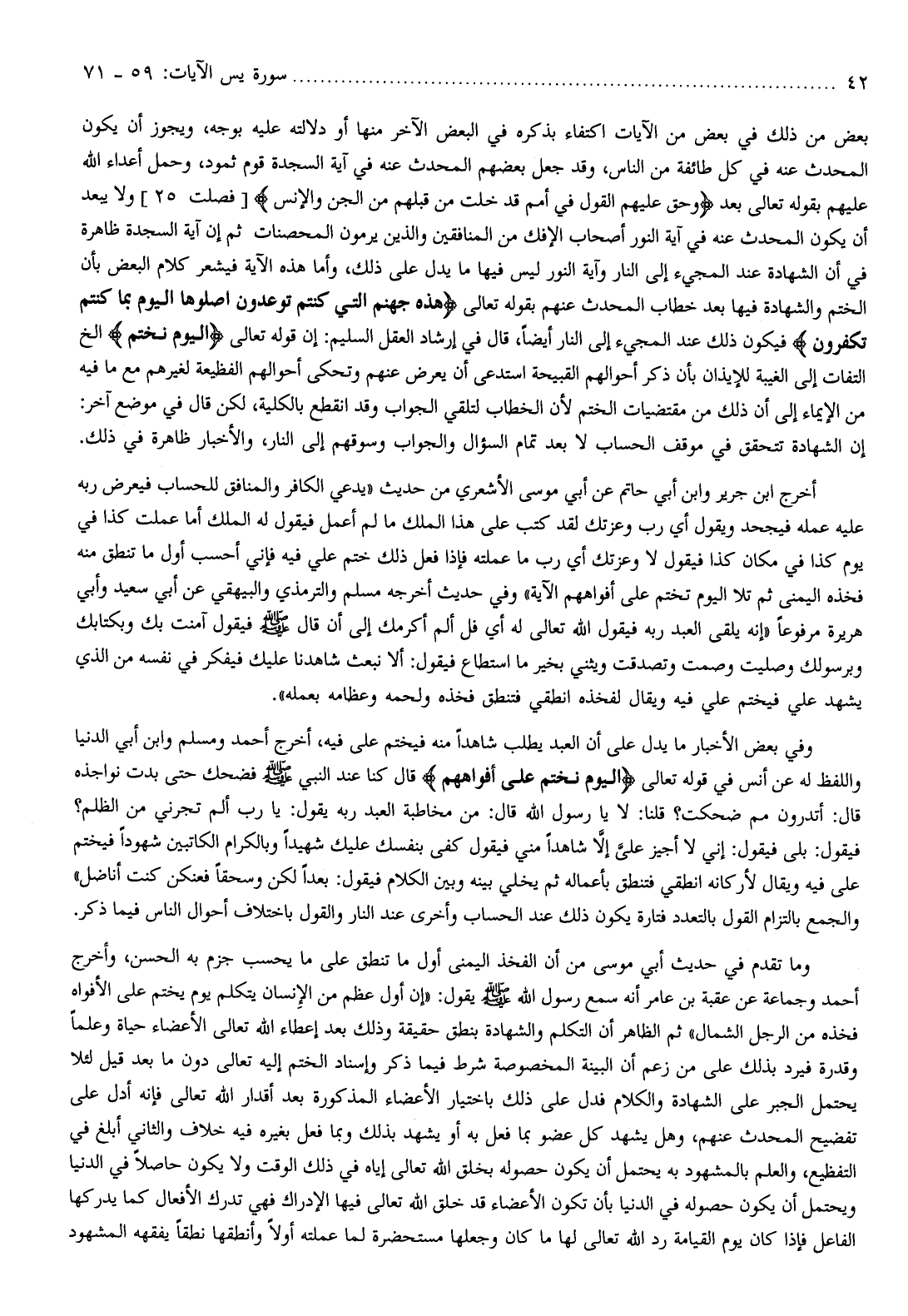 بعض من ذلك في بعض من الآيات اكتفاء بذكره في البعض الآخر منها أو دلالته عليه بوجه، ويجوز أن يكون المحدث عنه في كل طائفة من الناس، وقد جعل بعضهم المحدث عنه في آية السجدة قوم ثمود، وحمل أعداء الله عليهم بقوله تعالى بعد وَحَقَّ عَلَيْهِمُ الْقَوْلُ فِي أُمَمٍ قَدْ خَلَتْ مِنْ قَبْلِهِمْ مِنَ الْجِنِّ وَالْإِنْسِ [فصلت 25] ولا يبعد أن يكون المحدث عنه في آية النور أصحاب الإفك من المنافقين والذين يرمون المحصنات ثم إن آية السجدة ظاهرة في أن الشهادة عند المجيء إلى النار وآية النور ليس فيها ما يدل على ذلك، وأما هذه الآية فيشعر كلام البعض بأن الختم والشهادة فيها بعد خطاب المحدث عنهم بقوله تعالى هذِهِ جَهَنَّمُ الَّتِي كُنْتُمْ تُوعَدُونَ اصْلَوْهَا الْيَوْمَ بِما كُنْتُمْ تَكْفُرُونَ فيكون ذلك عند المجيء إلى النار أيضا، قال في إرشاد العقل السليم: إن قوله تعالى الْيَوْمَ نَخْتِمُ إلخ التفات إلى الغيبة للإيذان بأن ذكر أحوالهم القبيحة استدعى أن يعرض عنهم وتحكى أحوالهم الفظيعة لغيرهم مع ما فيه من الإيماء إلى أن ذلك من مقتضيات الختم لأن الخطاب لتلقي الجواب وقد انقطع بالكلية، لكن قال في موضع آخر: