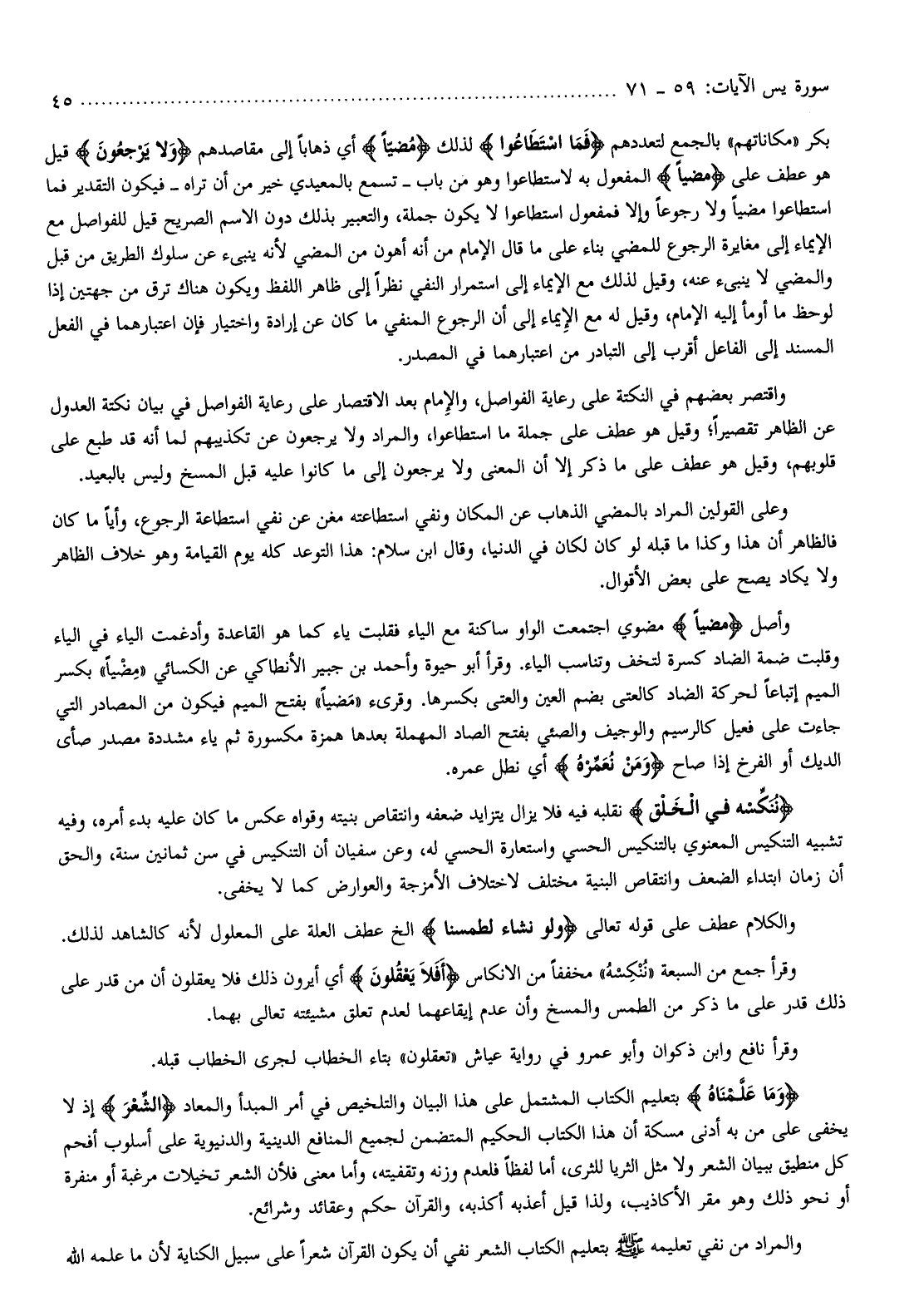 وأصل مُضِيًّا مضوي اجتمعت الواو ساكنة مع الياء فقلبت ياء كما هو القاعدة وأدغمت الياء في الياء وقلبت ضمة الضاد كسرة لتخف وتناسب الياء. وقرأ أبو حيوة وأحمد بن جبير الأنطاكي عن الكسائي «مضيا» بكسر الميم اتباعا لحركة الضاد كالعتى بضم العين والعتى بكسرها. وقرىء «مضيا» بفتح الميم فيكون من المصادر التي جاءت على فعيل كالرسيم والوجيف والصئي بفتح الصاد المهملة بعدها همزة مكسورة ثم ياء مشددة مصدر صأى الديك أو الفرخ إذا صاح وَمَنْ نُعَمِّرْهُ أي نطل عمره.