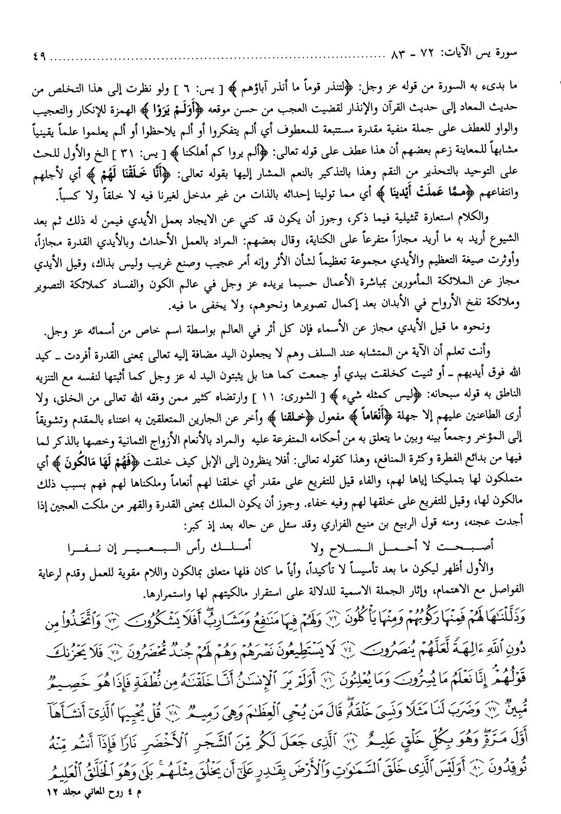 وأنت تعلم أن الآية من المتشابه عند السلف وهم لا يجعلون اليد مضافة إليه تعالى بمعنى القدرة أفردت- كيد الله فوق أيديهم- أو ثنيت كخلقت بيدي أو جمعت كما هنا بل يثبتون اليد له عز وجل كما أثبتها لنفسه مع التنزيه الناطق به قوله سبحانه: لَيْسَ كَمِثْلِهِ شَيْءٌ [الشورى: 11] وارتضاه كثير ممن وفقه الله تعالى من الخلق، ولا أرى الطاعنين عليهم إلا جهلة أَنْعاماً مفعول خَلَقْنا وأخر عن الجارين المتعلقين به اعتناء بالمقدم وتشويقا إلى المؤخر وجمعا بينه وبين ما يتعلق به من أحكامه المتفرعة عليه والمراد بالأنعام الأزواج الثمانية وخصها بالذكر لما فيها من بدائع الفطرة وكثرة المنافع، وهذا كقوله تعالى: أفلا ينظرون إلى الإبل كيف خلقت فَهُمْ لَها مالِكُونَ أي متملكون لها بتمليكنا إياها لهم، والفاء قيل للتفريع على مقدر أي خلقنا لهم أنعاما وملكناها لهم فهم بسبب ذلك مالكون لها، وقيل للتفريع على خلقها لهم وفيه خفاء. وجوز أن يكون الملك بمعنى القدرة والقهر من ملكت العجين إذا أجدت عجنه، ومنه قول الربيع بن منيع الفزاري وقد سئل عن حاله بعد إذ كبر: