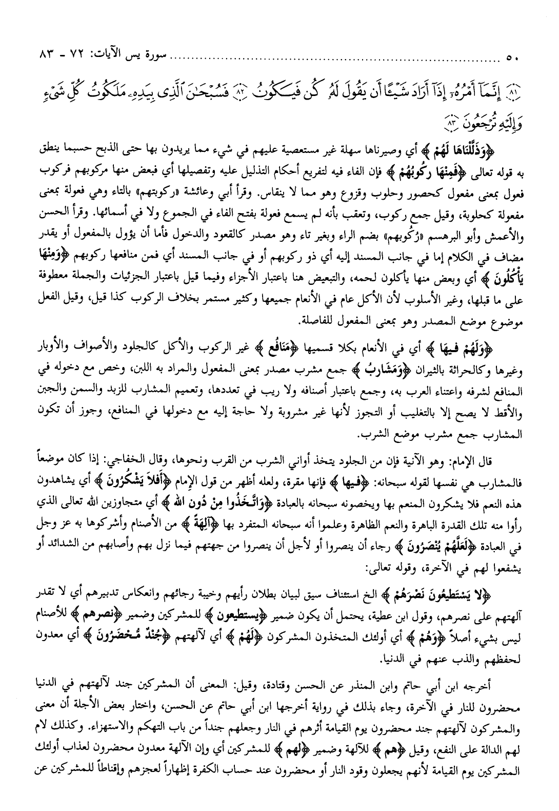 وَذَلَّلْناها لَهُمْ أي وصيرناها سهلة غير مستعصية عليهم في شيء مما يريدون بها حتى الذبح حسبما ينطق به قوله تعالى فَمِنْها رَكُوبُهُمْ فإن الفاء فيه لتفريع أحكام التذليل عليه وتفصيلها أي فبعض منها مركوبهم فركوب فعول بمعنى مفعول كحصور وحلوب وقزوع وهو مما لا ينقاس. وقرأ أبي وعائشة «ركوبتهم» بالتاء وهي فعولة بمعنى مفعولة كحلوبة، وقيل جمع ركوب، وتعقب بأنه لم يسمع فعولة بفتح الفاء في الجموع ولا في أسمائها. وقرأ الحسن والأعمش وأبو البرهسم «ركوبهم» بضم الراء وبغير تاء وهو مصدر كالقعود والدخول فأما أن يؤول بالمفعول أو يقدر مضاف في الكلام إما في جانب المسند إليه أي ذو ركوبهم أو في جانب المسند أي فمن منافعها ركوبهم وَمِنْها يَأْكُلُونَ أي وبعض منها يأكلون لحمه، والتبعيض هنا باعتبار الأجزاء وفيما قيل باعتبار الجزئيات والجملة معطوفة على ما قبلها، وغير الأسلوب لأن الأكل عام في الأنعام جميعها وكثير مستمر بخلاف الركوب كذا قيل، وقيل الفعل موضوع موضع المصدر وهو بمعنى المفعول للفاصلة.