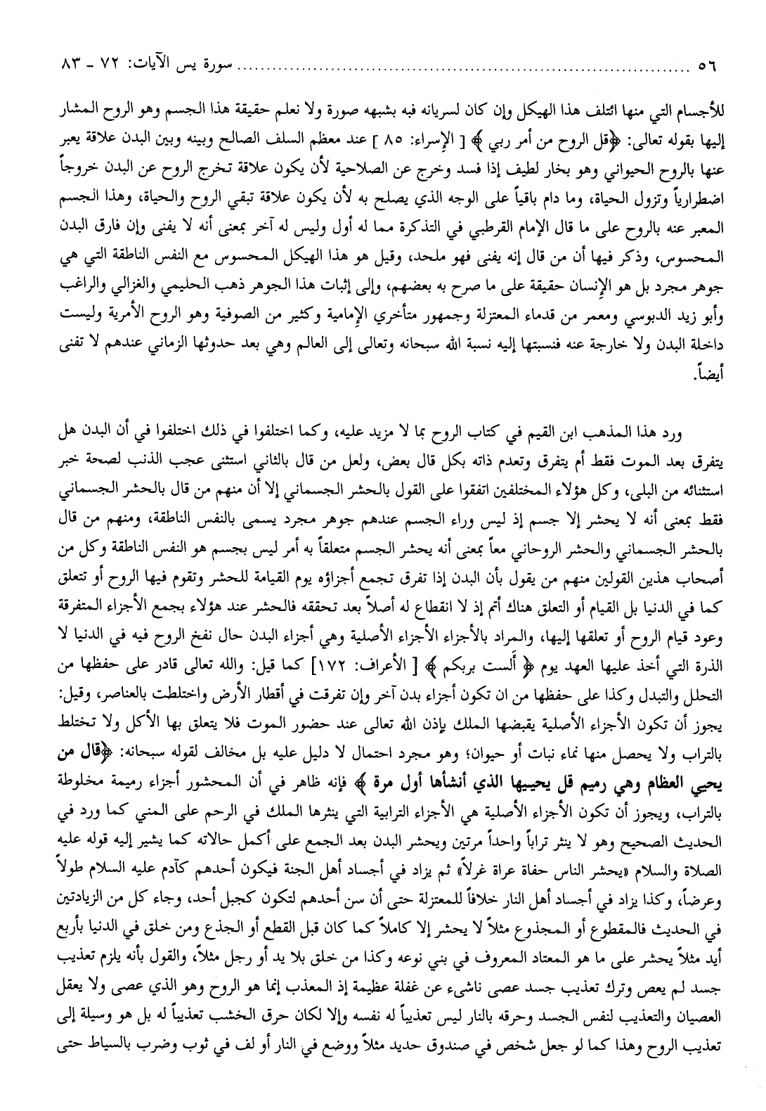 ورد هذا المذهب ابن القيم في كتاب الروح بما لا مزيد عليه، وكما اختلفوا في ذلك اختلفوا في أن البدن هل يتفرق بعد الموت فقط أم يتفرق وتعدم ذاته بكل قال بعض، ولعل من قال بالثاني استثنى عجب الذنب لصحة خبر استثنائه من البلى، وكل هؤلاء المختلفين اتفقوا على القول بالحشر الجسماني إلا أن منهم من قال بالحشر الجسماني فقط بمعنى أنه لا يحشر إلا جسم إذ ليس وراء الجسم عندهم جوهر مجرد يسمى بالنفس الناطقة، ومنهم من قال بالحشر الجسماني والحشر الروحاني معا بمعنى أنه يحشر الجسم متعلقا به أمر ليس بجسم هو النفس الناطقة وكل من أصحاب هذين القولين منهم من يقول بأن البدن إذا تفرق تجمع أجزاؤه يوم القيامة للحشر وتقوم فيها الروح أو تتعلق كما في الدنيا بل القيام أو التعلق هناك أتم إذ لا انقطاع له أصلا بعد تحققه فالحشر عند هؤلاء بجمع الأجزاء المتفرقة وعود قيام الروح أو تعلقها إليها، والمراد بالأجزاء الأجزاء الأصلية وهي أجزاء البدن حال نفخ الروح فيه في الدنيا لا الذرة التي أخذ عليها العهد يوم أَلَسْتُ بِرَبِّكُمْ [الأعراف: 172] كما قيل: والله تعالى قادر على حفظها من التحلل والتبدل وكذا على حفظها من ان تكون أجزاء بدن آخر وإن تفرقت في أقطار الأرض واختلطت بالعناصر، وقيل: