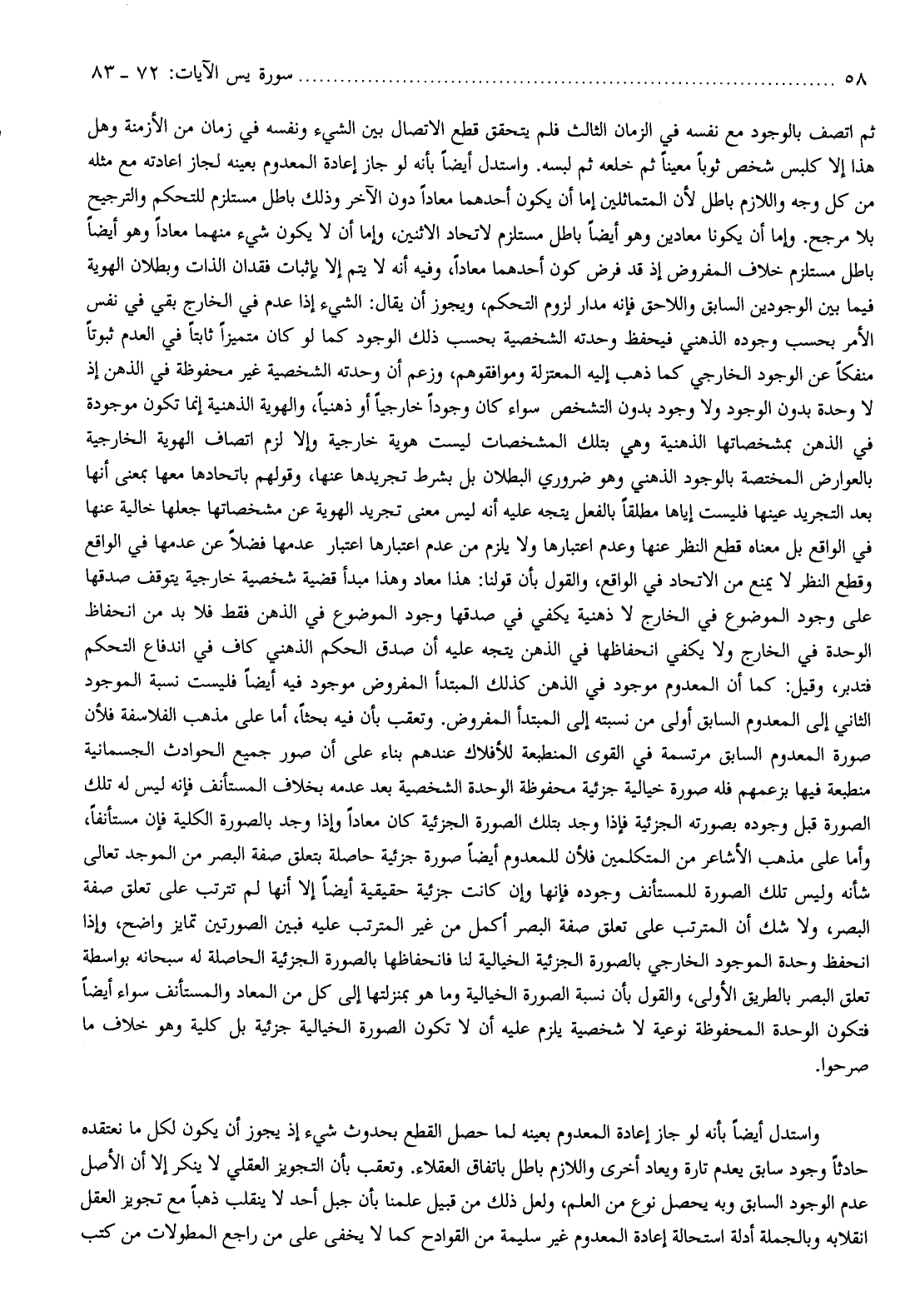 ثم اتصف بالوجود مع نفسه في الزمان الثالث فلم يتحقق قطع الاتصال بين الشيء ونفسه في زمان من الأزمنة وهل هذا إلا كلبس شخص ثوبا معينا ثم خلعه ثم لبسه. واستدل أيضا بأنه لو جاز إعادة المعدوم بعينه لجاز إعادته مع مثله من كل وجه واللازم باطل لأن المتماثلين إما أن يكون أحدهما معادا دون الآخر وذلك باطل مستلزم للتحكم والترجيح بلا مرجح. وإما أن يكونا معادين وهو أيضا باطل مستلزم لاتحاد الاثنين، وإما أن لا يكون شيء منهما معادا وهو أيضا باطل مستلزم خلاف المفروض إذ قد فرض كون أحدهما معادا، وفيه أنه لا يتم إلا بإثبات فقدان الذات وبطلان الهوية فيما بين الوجودين السابق واللاحق فإنه مدار لزوم التحكم، ويجوز أن يقال: الشيء إذا عدم في الخارج بقي في نفس الأمر بحسب وجوده الذهني فيحفظ وحدته الشخصية بحسب ذلك الوجود كما لو كان متميزا ثابتا في العدم ثبوتا منفكا عن الوجود الخارجي كما ذهب إليه المعتزلة وموافقوهم، وزعم أن وحدته الشخصية غير محفوظة في الذهن إذ لا وحدة بدون الوجود ولا وجود بدون التشخص سواء كان وجودا خارجيا أو ذهنيا، والهوية الذهنية إنما تكون موجودة في الذهن بمشخصاتها الذهنية وهي بتلك المشخصات ليست هوية خارجية وإلا لزم اتصاف الهوية الخارجية بالعوارض المختصة بالوجود الذهني وهو ضروري البطلان بل بشرط تجريدها عنها، وقولهم باتحادها معها بمعنى أنها بعد التجريد عينها فليست إياها مطلقا بالفعل يتجه عليه أنه ليس معنى تجريد الهوية عن مشخصاتها جعلها خالية عنها في الواقع بل معناه قطع النظر عنها وعدم اعتبارها ولا يلزم من عدم اعتبارها اعتبار عدمها فضلا عن عدمها في الواقع وقطع النظر لا يمنع من الاتحاد في الواقع، والقول بأن قولنا: هذا معاد وهذا مبدأ قضية شخصية خارجية يتوقف صدقها على وجود الموضوع في الخارج لا ذهنية يكفي في صدقها وجود الموضوع في الذهن فقط فلا بد من انحفاظ الوحدة في الخارج ولا يكفي انحفاظها في الذهن يتجه عليه أن صدق الحكم الذهني كاف في اندفاع التحكم فتدبر، وقيل: كما أن المعدوم موجود في الذهن كذلك المبتدأ المفروض موجود فيه أيضا فليست نسبة الموجود الثاني إلى المعدوم السابق أولى من نسبته إلى المبتدأ المفروض. وتعقب بأن فيه بحثا، أما على مذهب الفلاسفة فلأن صورة المعدوم السابق مرتسمة في القوى المنطبعة للأفلاك عندهم بناء على أن صور جميع الحوادث الجسمانية منطبعة فيها بزعمهم فله صورة خيالية جزئية محفوظة الوحدة الشخصية بعد عدمه بخلاف المستأنف فإنه ليس له تلك الصورة قبل وجوده بصورته الجزئية فإذا وجد بتلك الصورة الجزئية كان معادا وإذا وجد بالصورة الكلية فإن مستأنفا، وأما على مذهب الأشاعرة من المتكلمين فلأن للمعدوم أيضا صورة جزئية حاصلة بتعلق صفة البصر من الموجد تعالى شأنه وليس تلك الصورة للمستأنف وجوده فإنها وإن كانت جزئية حقيقية أيضا إلا أنها لم تترتب على تعلق صفة البصر، ولا شك أن المترتب على تعلق صفة البصر أكمل من غير المترتب عليه فبين الصورتين تمايز واضح، وإذا انحفظ وحدة الموجود الخارجي بالصورة الجزئية الخيالية لنا فانحفاظها بالصورة الجزئية الحاصلة له سبحانه بواسطة تعلق البصر بالطريق الأولى، والقول بأن نسبة الصورة الخيالية وما هو بمنزلتها إلى كل من المعاد والمستأنف سواء أيضا فتكون الوحدة المحفوظة نوعية لا شخصية يلزم عليه أن لا تكون الصورة الخيالية جزئية بل كلية وهو خلاف ما صرحوا.