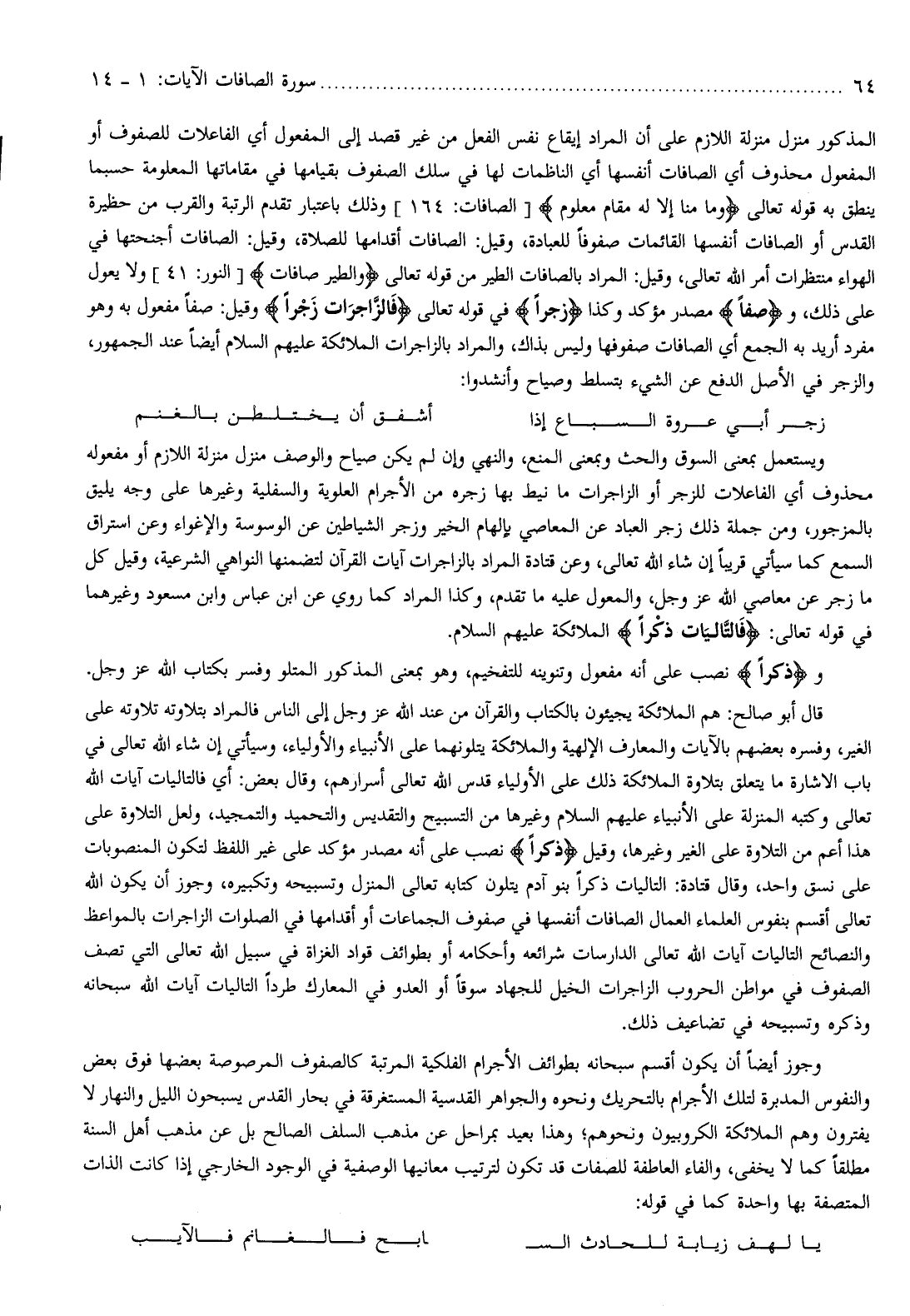 المذكور منزل منزلة اللازم على أن المراد إيقاع نفس الفعل من غير قصد إلى المفعول أي الفاعلات للصفوف أو المفعول محذوف أي الصافات أنفسها أي الناظمات لها في سلك الصفوف بقيامها في مقاماتها المعلومة حسبما ينطق به قوله تعالى وَما مِنَّا إِلَّا لَهُ مَقامٌ مَعْلُومٌ [الصافات: 164] وذلك باعتبار تقدم الرتبة والقرب من حظيرة القدس أو الصافات أنفسها القائمات صفوفا للعبادة، وقيل: الصافات أقدامها للصلاة، وقيل: الصافات أجنحتها في الهواء منتظرات أمر الله تعالى، وقيل: المراد بالصافات الطير من قوله تعالى وَالطَّيْرُ صَافَّاتٍ [النور: 41] ولا يعول على ذلك، وصَفًّا مصدر مؤكد وكذا زَجْراً في قوله تعالى فَالزَّاجِراتِ زَجْراً وقيل: صفا مفعول به وهو مفرد أريد به الجمع أي الصافات صفوفها وليس بذاك، والمراد بالزاجرات الملائكة عليهم السلام أيضا عند الجمهور، والزجر في الأصل الدفع عن الشيء بتسلط وصياح وأنشدوا: