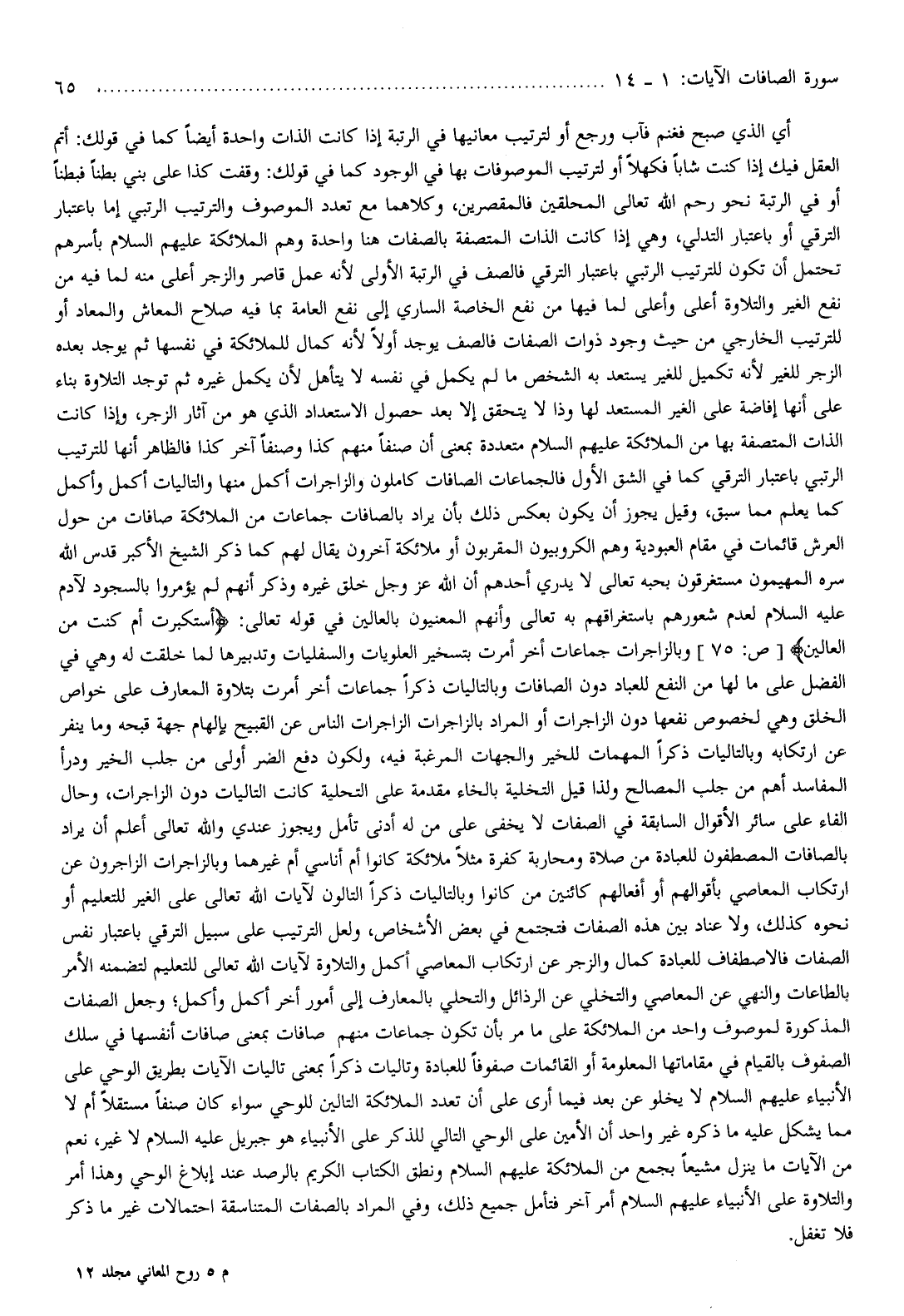 أي الذي صبح فغنم فآب ورجع أو لترتيب معانيها في الرتبة إذا كانت الذات واحدة أيضا كما في قولك: أتم العقل فيك إذا كنت شابا فكهلا أو لترتيب الموصوفات بها في الوجود كما في قولك: وقفت كذا على بني بطنا فبطنا أو في الرتبة نحو رحم الله تعالى المحلقين فالمقصرين، وكلاهما مع تعدد الموصوف والترتيب الرتبي إما باعتبار الترقي أو باعتبار التدلي، وهي إذا كانت الذات المتصفة بالصفات هنا واحدة وهم الملائكة عليهم السلام بأسرهم تحتمل أن تكون للترتيب الرتبي باعتبار الترقي فالصف في الرتبة الأولى لأنه عمل قاصر والزجر أعلى منه لما فيه من نفع الغير والتلاوة أعلى وأعلى لما فيها من نفع الخاصة الساري إلى نفع العامة بما فيه صلاح المعاش والمعاد أو للترتيب الخارجي من حيث وجود ذوات الصفات فالصف يوجد أولا لأنه كمال للملائكة في نفسها ثم يوجد بعده الزجر للغير لأنه تكميل للغير يستعد به الشخص ما لم يكمل في نفسه لا يتأهل لأن يكمل غيره ثم توجد التلاوة بناء على أنها إفاضة على الغير المستعد لها وذا لا يتحقق إلا بعد حصول الاستعداد الذي هو من آثار الزجر، وإذا كانت الذات المتصفة بها من الملائكة عليهم السلام متعددة بمعنى أن صنفا منهم كذا وصنفا آخر كذا فالظاهر أنها للترتيب الرتبي باعتبار الترقي كما في الشق الأول فالجماعات الصافات كاملون والزاجرات أكمل منها والتاليات أكمل وأكمل كما يعلم مما سبق، وقيل يجوز أن يكون بعكس ذلك بأن يراد بالصافات جماعات من الملائكة صافات من حول العرش قائمات في مقام العبودية وهم الكروبيون المقربون أو ملائكة آخرون يقال لهم كما ذكر الشيخ الأكبر قدس الله سره المهيمون مستغرقون بحبه تعالى لا يدري أحدهم أن الله عز وجل خلق غيره وذكر أنهم لم يؤمروا بالسجود لآدم عليه السلام لعدم شعورهم باستغراقهم به تعالى وأنهم المعنيون بالعالين في قوله تعالى: أَسْتَكْبَرْتَ أَمْ كُنْتَ مِنَ الْعالِينَ [ص: 75] وبالزاجرات جماعات أخر أمرت بتسخير العلويات والسفليات وتدبيرها لما خلقت له وهي في الفضل على ما لها من النفع للعباد دون الصافات وبالتاليات ذكرا جماعات أخر أمرت بتلاوة المعارف على خواص الخلق وهي لخصوص نفعها دون الزاجرات أو المراد بالزاجرات الزاجرات الناس عن القبيح بإلهام جهة قبحه وما ينفر عن ارتكابه وبالتاليات ذكرا المهمات للخير والجهات المرغبة فيه، ولكون دفع الضر أولى من جلب الخير ودرأ المفاسد أهم من جلب المصالح ولذا قيل التخلية بالخاء مقدمة على التحلية كانت التاليات دون الزاجرات، وحال الفاء على سائر الأقوال السابقة في الصفات لا يخفى على من له أدنى تأمل ويجوز عندي والله تعالى أعلم أن يراد بالصافات المصطفون للعبادة من صلاة ومحاربة كفرة مثلا ملائكة كانوا أم أناسي أم غيرهما وبالزاجرات الزاجرون عن ارتكاب المعاصي بأقوالهم أو أفعالهم كائنين من كانوا وبالتاليات ذكرا التالون لآيات الله تعالى على الغير للتعليم أو نحوه كذلك، ولا عناد بين هذه الصفات فتجتمع في بعض الأشخاص، ولعل الترتيب على سبيل الترقي باعتبار نفس الصفات فالاصطفاف للعبادة كمال والزجر عن ارتكاب المعاصي أكمل والتلاوة لآيات الله تعالى للتعليم لتضمنه الأمر بالطاعات والنهي عن المعاصي والتخلي عن الرذائل والتحلي بالمعارف إلى أمور أخر أكمل وأكمل وجعل الصفات المذكورة لموصوف واحد من الملائكة على ما مر بأن تكون جماعات منهم صافات بمعنى صافات أنفسها في سلك الصفوف بالقيام في مقاماتها المعلومة أو القائمات صفوفا للعبادة وتاليات ذكرا بمعنى تاليات الآيات بطريق الوحي على الأنبياء عليهم السلام لا يخلو عن بعد فيما أرى على أن تعدد الملائكة التالين للوحي سواء كان صنفا مستقلا أم لا مما يشكل عليه ما ذكره غير واحد أن الأمين على الوحي التالي للذكر على الأنبياء هو جبريل عليه السلام لا غير، نعم من الآيات ما ينزل مشيعا بجمع من الملائكة عليهم السلام ونطق الكتاب الكريم بالرصد عند إبلاغ الوحي وهذا أمر والتلاوة على الأنبياء عليهم السلام أمر آخر فتأمل جميع ذلك، 
