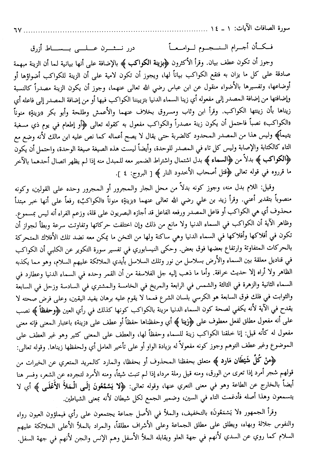 مِنْ كُلِّ شَيْطانٍ مارِدٍ متعلق بحفظنا المحذوف أو بحفظا، والمارد كالمريد المتعري عن الخيرات من قولهم شجر أمرد إذا تعرى من الورق، ومنه قيل رملة مرداء إذا لم تنبت شيئا، ومنه الأمرد لتجرده عن الشعر، وفسر هنا أيضا بالخارج عن الطاعة وهو في معنى التعري عنها، وقوله تعالى: لا يَسَّمَّعُونَ إِلَى الْمَلَإِ الْأَعْلى أي لا يتسمعون وهذا أصله فأدغمت التاء في السين، وضمير الجمع لكل شيطان لأنه بمعنى الشياطين.
