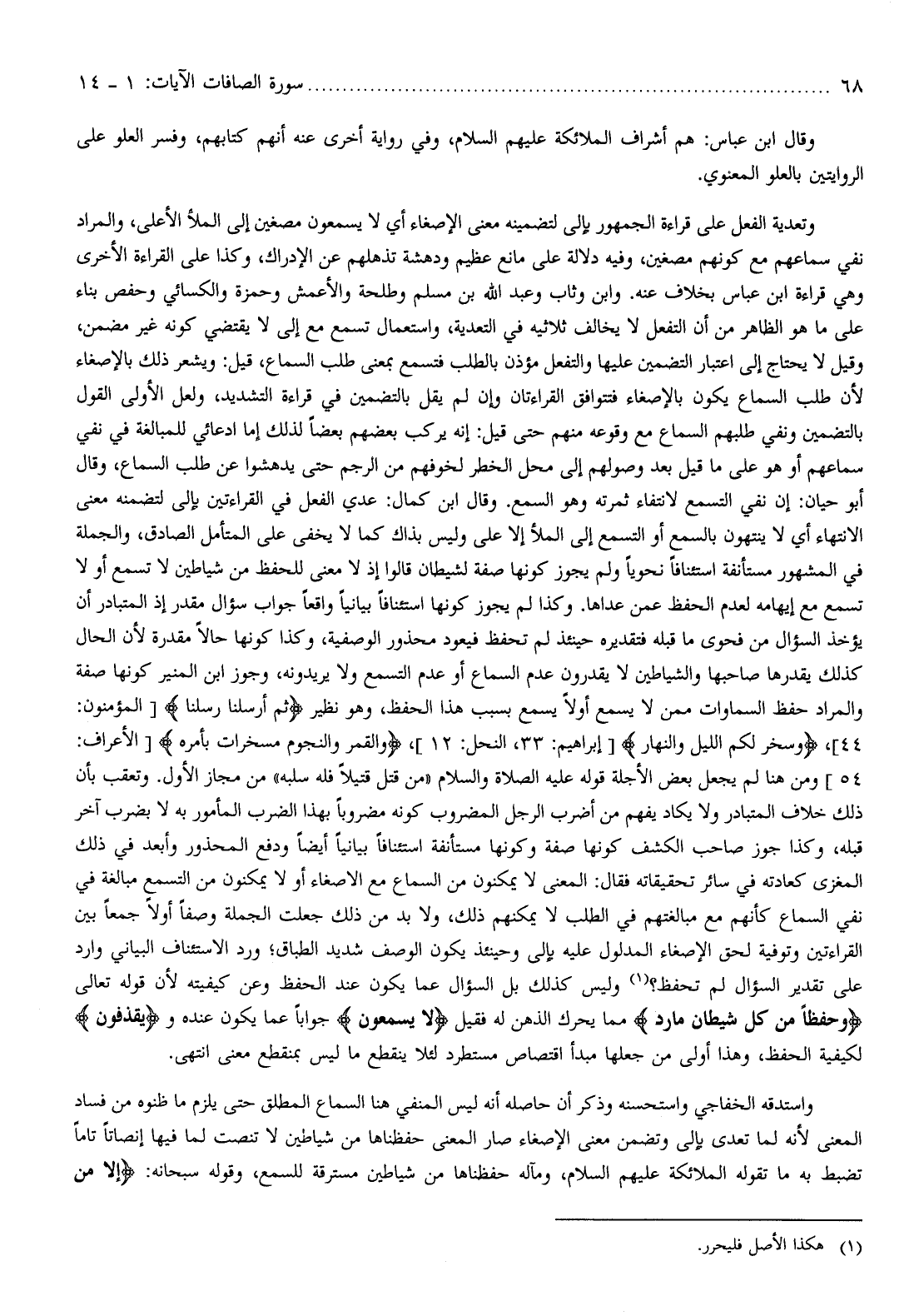 من مجاز الأول. وتعقب بأن ذلك خلاف المتبادر ولا يكاد يفهم من أضرب الرجل المضروب كونه مضروبا بهذا الضرب المأمور به لا بضرب آخر قبله، وكذا جوز صاحب الكشف كونها صفة وكونها مستأنفة استئنافا بيانيا أيضا ودفع المحذور وأبعد في ذلك المغزى كعادته في سائر تحقيقاته فقال: المعنى لا يمكنون من السماع مع الإصغاء أو لا يمكنون من التسمع مبالغة في نفي السماع كأنهم مع مبالغتهم في الطلب لا يمكنهم ذلك، ولا بد من ذلك جعلت الجملة وصفا أولا جمعا بين القراءتين وتوفية لحق الإصغاء المدلول عليه بإلى وحينئذ يكون الوصف شديد الطباق ورد الاستئناف البياني وارد على تقدير السؤال لم تحفظ؟ (¬1) وليس كذلك بل السؤال عما يكون عند الحفظ وعن كيفيته لأن قوله تعالى وَحِفْظاً مِنْ كُلِّ شَيْطانٍ مارِدٍ مما يحرك الذهن له فقيل لا يَسَّمَّعُونَ جوابا عما يكون عنده ويُقْذَفُونَ لكيفية الحفظ، وهذا أولى من جعلها مبدأ اقتصاص مستطرد لئلا ينقطع ما ليس بمنقطع معنى انتهى.
