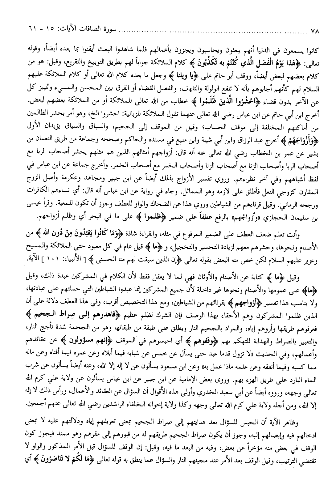وظاهر الآية أن الحبس للسؤال بعد هدايتهم إلى صراط الجحيم بمعنى تعريفهم إياه ودلالتهم عليه لا بمعنى ادخالهم فيه وإيصالهم إليه، وجوز أن يكون صراط الجحيم طريقهم له من قبورهم إلى مقرهم وهو ممتد فيجوز كون الوقف في بعض منه مؤخرا عن بعض، وفيه من البعد ما فيه، وقيل: إن الوقف للسؤال قبل الأمر المذكور والواو لا تقتضي الترتيب، وقيل الوقف بعد الأمر عند مجيئهم النار والسؤال عما ينطق به قوله تعالى ما لَكُمْ لا تَناصَرُونَ أي