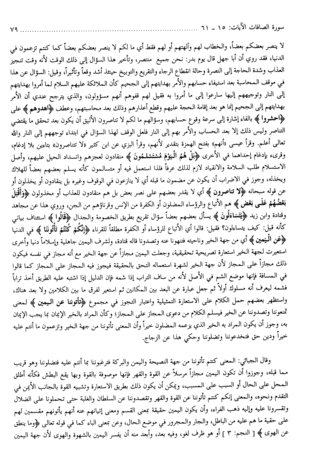 لا ينصر بعضكم بعضا، والخطاب لهم وآلهتهم أو لهم فقط أي ما لكم لا ينصر بعضكم بعضا كما كنتم تزعمون في الدنيا، فقد روي أن أبا جهل قال يوم بدر: نحن جميع منتصر، وتأخير هذا السؤال إلى ذلك الوقت لأنه وقت تنجيز العذاب وشدة الحاجة إلى النصرة وحالة انقطاع الرجاء والتقريع والتوبيخ حينئذ أشد وقعا وتأثيرا، وقيل: السؤال عن هذا في موقف المحاسبة بعد استيفاء حسابهم والأمر بهدايتهم إلى الجحيم كأن الملائكة عليهم السلام لما أمروا بهدايتهم إلى النار وتوجيههم إليها سارعوا إلى ما أمروا به فقيل لهم قفوهم أنهم مسؤولون، والذي يترجح عندي أن الأمر بهدايتهم إلى الجحيم إنما هو بعد إقامة الحجة عليهم وقطع أعذارهم وذلك بعد محاسبتهم، وعطف (اهدوهم) على احْشُرُوا بالفاء إشارة إلى سرعة وقوع حسابهم، وسؤالهم ما لكم لا تناصرون الأليق أن يكون بعد تحقق ما يقتضي التناصر وليس ذلك إلا بعد الحساب والأمر بهم إلى النار فلعل الوقف لهذا السؤال في ابتداء توجههم إلى النار والله تعالى أعلم. وقرأ عيسى «أنهم» بفتح الهمزة بتقدير لأنهم، وقرأ البزي عن ابن كثير «لا تتناصرون» بتاءين بلا إدغام، وقرىء بإدغام إحداهما في الأخرى بَلْ هُمُ الْيَوْمَ مُسْتَسْلِمُونَ منقادون لعجزهم وانسداد الحيل عليهم، وأصل الاستسلام طلب السلامة والانقياد لازم لذلك عرفا فلذا استعمل فيه أو متسالمون كأنه يسلم بعضهم بعضا للهلاك ويخذله، وجوز في الاضراب أن يكون عن مضمون ما قبله أي لا ينازعون في الوقوف وغيره بل ينقادون أو يخذلون أو عن قوله سبحانه لا تَناصَرُونَ أي لا يقدر بعضهم على نصر بعض بل هم منقادون للعذاب أو مخذولون وَأَقْبَلَ بَعْضُهُمْ عَلى بَعْضٍ هم الأتباع والرؤساء المضلون أو الكفرة من الإنس وقرناؤهم من الجن، وروي هذا عن مجاهد وقتادة وابن زيد يَتَساءَلُونَ يسأل بعضهم بعضا سؤال تقريع بطريق الخصومة والجدال قالُوا استئناف بياني كأنه قيل: كيف يتساءلون؟ فقيل: قالوا أي الأتباع للرؤساء أو الكفرة مطلقا للقرناء إِنَّكُمْ كُنْتُمْ تَأْتُونَنا في الدنيا عَنِ الْيَمِينِ أي من جهة الخير وناحيته فتنهونا عنه وتصدونا قاله قتادة، ولشرف اليمين جاهلية وإسلاما دنيا وأخرى استعيرت لجهة الخير استعارة تصريحية تحقيقية، وجعلت اليمين مجازا عن جهة الخير مع أنه مجاز في نفسه فيكون ذلك مجازا على المجاز لأن جهة الخير لشهرة استعماله التحق بالحقيقة فيجوز فيه المجاز على المجاز كما قالوا في المسافة فإنها موضع الشم في الأصل لأنه من ساف التراب إذا شمه فإن الدليل إذا اشتبه عليه الطريق أخذ ترابا فشمه ليعرف أنه مسلوك أولا ثم جعل عبارة عن البعد بين المكانين ثم استعير لفرق ما بين الكلامين ولا بعد هناك، واستظهر بعضهم حمل الكلام على الاستعارة التمثيلية واعتبار التجوز في مجموع تَأْتُونَنا عَنِ الْيَمِينِ لمعنى تمنعوننا وتصدوننا عن الخير فيسلم الكلام من دعوى المجاز على المجاز وكأن المراد بالخير الإيمان بما يجب الإيمان به، وجوز أن يكون المراد به الخير الذي يزعمه المضلون خيرا وأن المعنى تأتوننا من جهة الخير وتزعمون ما أنتم عليه خيرا ودين حق فتخدعوننا وتضلوننا وحكي هذا عن الزجاج.