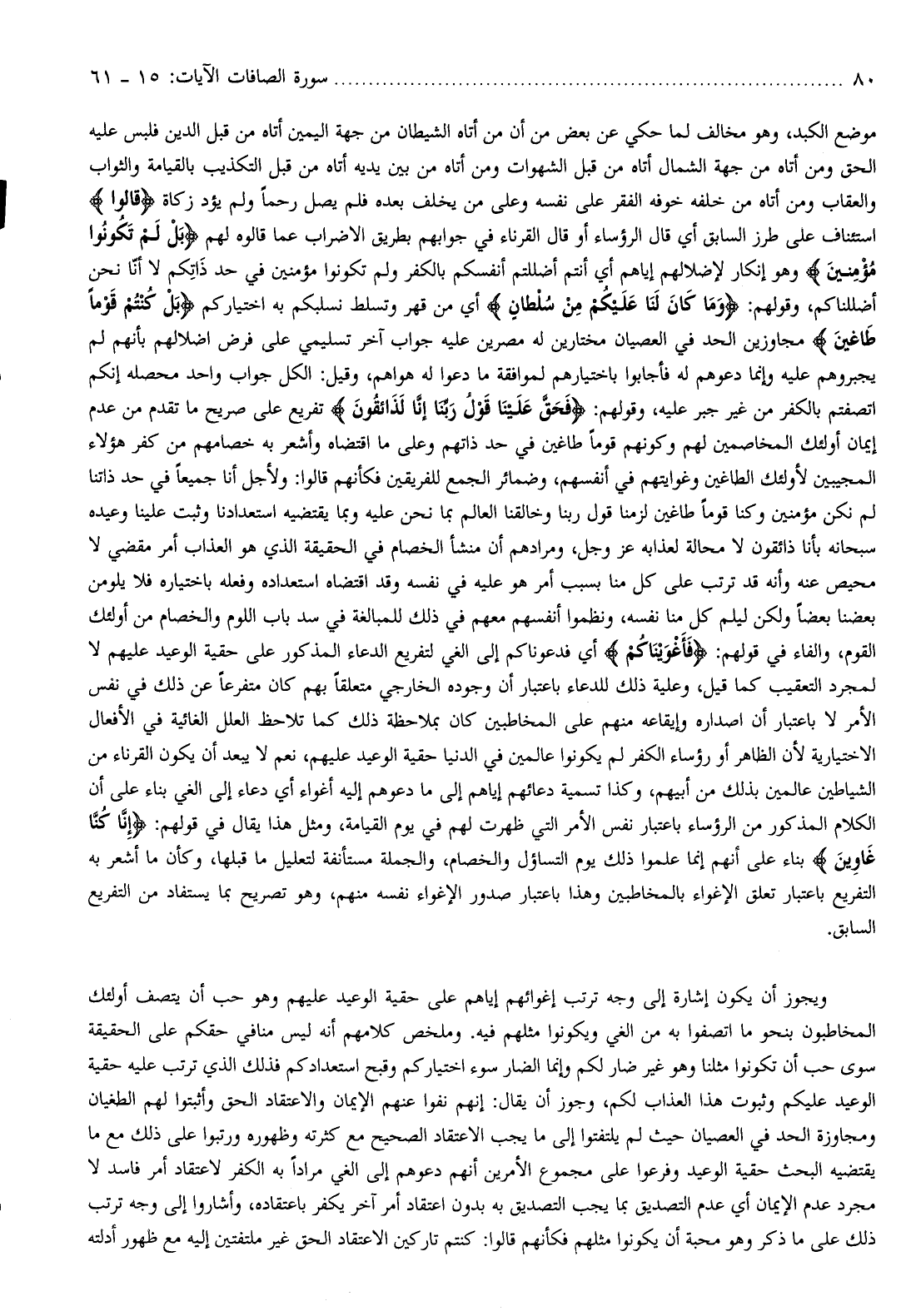 ويجوز أن يكون إشارة إلى وجه ترتب إغوائهم إياهم على حقية الوعيد عليهم وهو حب أن يتصف أولئك المخاطبون بنحو ما اتصفوا به من الغي ويكونوا مثلهم فيه. وملخص كلامهم أنه ليس منافي حقكم على الحقيقة سوى حب أن تكونوا مثلنا وهو غير ضار لكم وإنما الضار سوء اختياركم وقبح استعدادكم فذلك الذي ترتب عليه حقية الوعيد عليكم وثبوت هذا العذاب لكم، وجوز أن يقال: إنهم نفوا عنهم الإيمان والاعتقاد الحق وأثبتوا لهم الطغيان ومجاوزة الحد في العصيان حيث لم يلتفتوا إلى ما يجب الاعتقاد الصحيح مع كثرته وظهوره ورتبوا على ذلك مع ما يقتضيه البحث حقية الوعيد وفرعوا على مجموع الأمرين أنهم دعوهم إلى الغي مرادا به الكفر لاعتقاد أمر فاسد لا مجرد عدم الإيمان أي عدم التصديق بما يجب التصديق به بدون اعتقاد أمر آخر يكفر باعتقاده، وأشاروا إلى وجه ترتب ذلك على ما ذكر وهو محبة أن يكونوا مثلهم فكأنهم قالوا: كنتم تاركين الاعتقاد الحق غير ملتفتين إليه مع ظهور أدلته