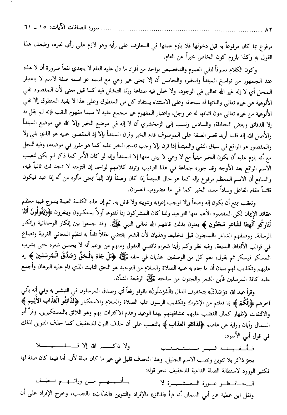 وتعقب بمنع أن يكون إله وصفا وإلا لوجب إعرابه وتنوينه ولا قائل به. ثم إن هذه الكلمة الطيبة يندرج فيها معظم عقائد الإيمان لكن المقصود الأهم منها التوحيد ولذا كان المشركون إذا لقنوها أولا يستكبرون وينفرون وَيَقُولُونَ أَإِنَّا لَتارِكُوا آلِهَتِنا لِشاعِرٍ مَجْنُونٍ يعنون بذلك قاتلهم الله تعالى النبي صلّى الله عليه وسلم. وقد جمعوا بين إنكار الوحدانية وإنكار الرسالة. ووصفهم الشاعر بالمجنون قيل تخليط وهذيان لأن الشعر يقتضي عقلا تاما به تنظم المعاني الغريبة وتصاغ في قوالب الألفاظ البديعة. وفيه نظر وكم رأينا شعراء ناقصي العقول ومنهم من يزعم أنه لا يحسن شعره حتى يشرب المسكر فيسكر ثم يقول، نعم كل من الوصفين هذيان في حقه صلّى الله عليه وسلم بَلْ جاءَ بِالْحَقِّ وَصَدَّقَ الْمُرْسَلِينَ رد عليهم وتكذيب لهم ببيان أن ما جاء به عليه الصلاة والسلام من التوحيد هو الحق الثابت الذي قام عليه البرهان وأجمع عليه كافة المرسلين فأين الشعر والجنون من ساحته صلّى الله عليه وسلم الرفيعة الشأن.