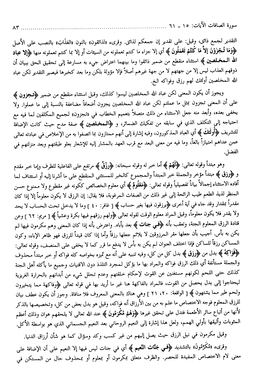 ويجوز أن يكون المعنى لكن عباد الله المخلصين ليسوا كذلك، وقيل استثناء منقطع من ضمير تُجْزَوْنَ على أن المعنى تجزون بمثل ما عملتم لكن عباد الله المخلصين يجزون أضعافا مضاعفة بالنسبة إلى ما عملوا. ولا يخفى بعده، وأبعد منه جعل الاستثناء من ذلك متصلا بتعميم الخطاب في «تجزون» لجميع المكلفين لما فيه مع احتياجه إلى التكلف الذي في سابقه من تفكيك الضمائر، والْمُخْلَصِينَ صفة مدح حيث كانت الإضافة للتشريف أُولئِكَ أي العباد المذكورون، وفيه إشارة إلى أنهم ممتازون بما اتصفوا به من الإخلاص في عبادته تعالى عمن عداهم امتيازا بالغا، وما فيه من معنى البعد مع قرب العهد بالمشار إليه للإشعار بعلو طبقتهم وبعد منزلتهم في الفضل.