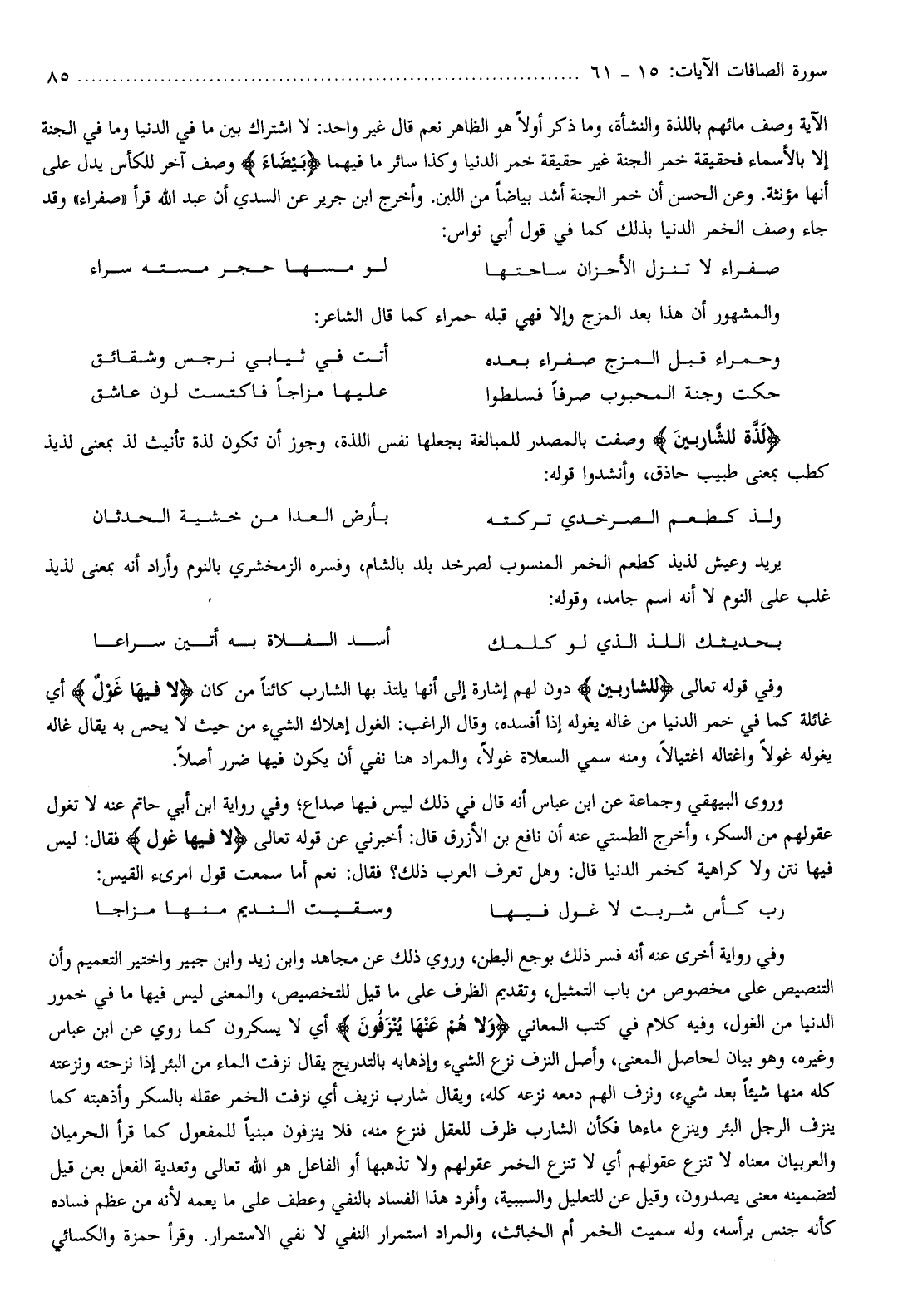 وروى البيهقي وجماعة عن ابن عباس أنه قال في ذلك ليس فيها صداع وفي رواية ابن أبي حاتم عنه لا تغول عقولهم من السكر، وأخرج الطستي عنه أن نافع بن الأزرق قال: أخبرني عن قوله تعالى لا فِيها غَوْلٌ فقال: ليس فيها نتن ولا كراهية كخمر الدنيا قال: وهل تعرف العرب ذلك؟ فقال: نعم أما سمعت قول امرئ القيس: