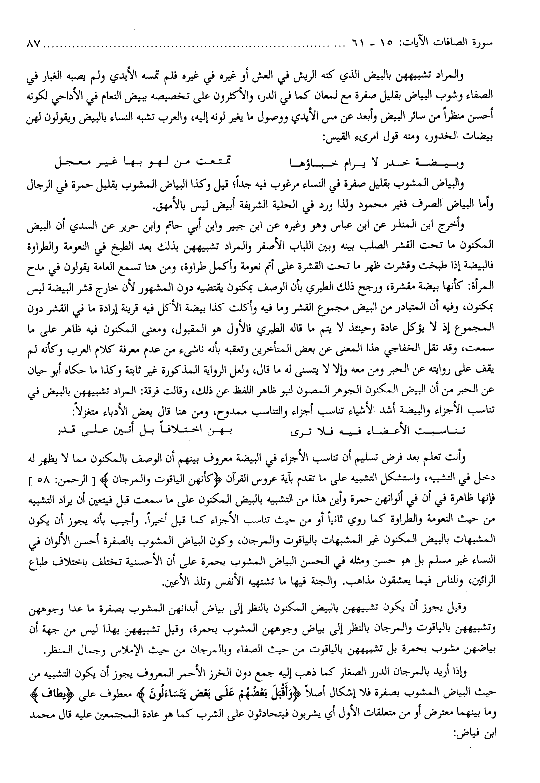 وقيل يجوز أن يكون تشبيههن بالبيض المكنون بالنظر إلى بياض أبدانهن المشوب بصفرة ما عدا وجوههن وتشبيههن بالياقوت والمرجان بالنظر إلى بياض وجوههن المشوب بحمرة، وقيل تشبيههن بهذا ليس من جهة أن بياضهن مشوب بحمرة بل تشبيههن بالياقوت من حيث الصفاء وبالمرجان من حيث الإملاس وجمال المنظر.