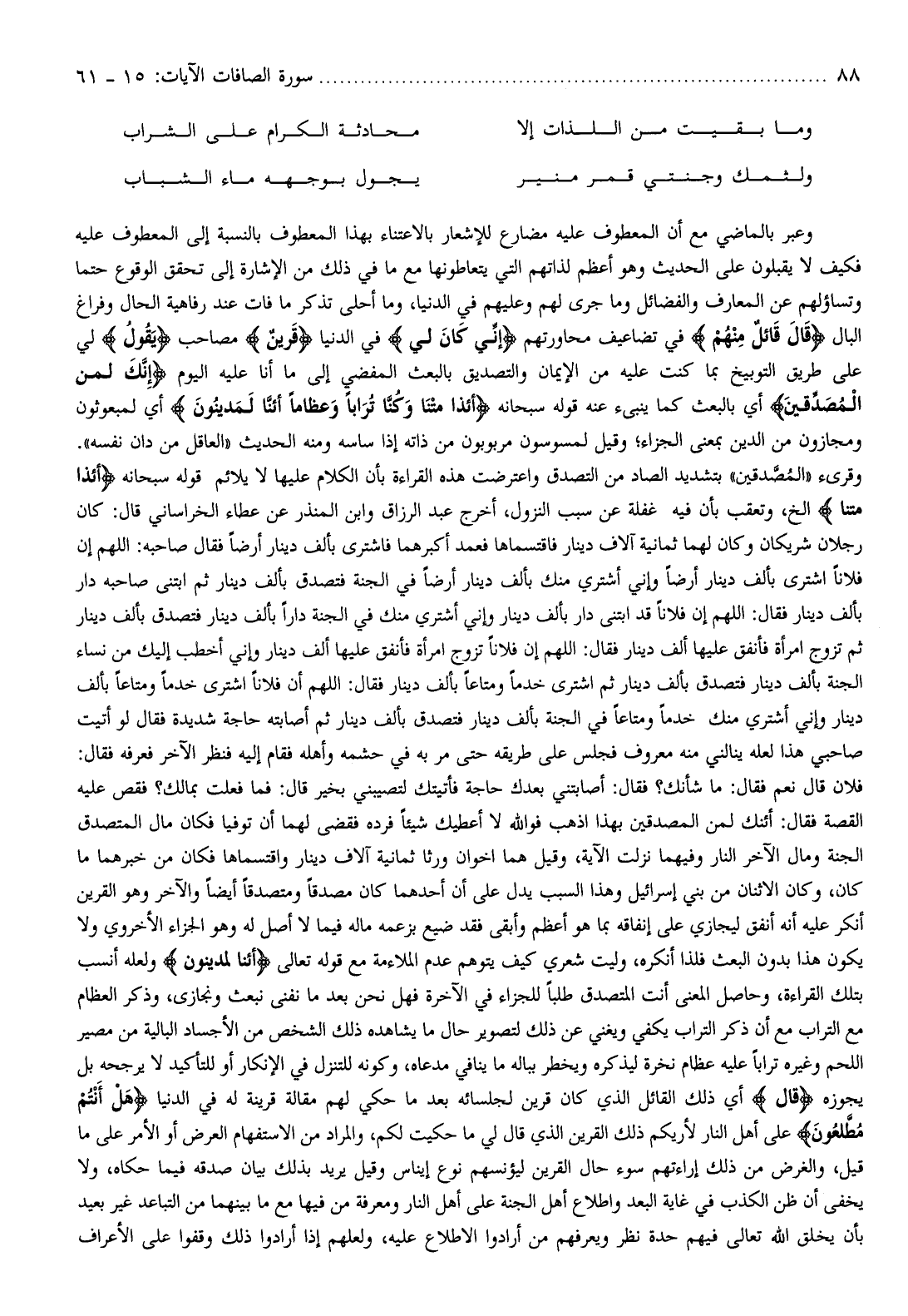 فلان قال نعم فقال: ما شأنك؟ فقال: أصابتني بعدك حاجة فأتيتك لتصيبني بخير قال: فما فعلت بمالك؟ فقص عليه القصة فقال: أإنك لمن المصدقين بهذا اذهب فو الله لا أعطيك شيئا فرده فقضى لهما أن توفيا فكان مال المتصدق الجنة ومال الآخر النار وفيهما نزلت الآية، وقيل هما اخوان ورثا ثمانية آلاف دينار واقتسماها فكان من خبرهما ما كان، وكان الاثنان من بني إسرائيل وهذا السبب يدل على أن أحدهما كان مصدقا ومتصدقا أيضا والآخر وهو القرين أنكر عليه أنه أنفق ليجازي على إنفاقه بما هو أعظم وأبقى فقد ضيع بزعمه ماله فيما لا أصل له وهو الجزاء الأخروي ولا يكون هذا بدون البعث فلذا أنكره، وليت شعري كيف يتوهم عدم الملاءمة مع قوله تعالى أَإِنَّا لَمَدِينُونَ ولعله أنسب بتلك القراءة، وحاصل المعنى أنت المتصدق طلبا للجزاء في الآخرة فهل نحن بعد ما نفنى نبعث ونجازى، وذكر العظام مع التراب مع أن ذكر التراب يكفي ويغني عن ذلك لتصوير حال ما يشاهده ذلك الشخص من الأجساد البالية من مصير اللحم وغيره ترابا عليه عظام نخرة ليذكره ويخطر بباله ما ينافي مدعاه، وكونه للتنزل في الإنكار أو للتأكيد لا يرجحه بل يجوزه قالَ أي ذلك القائل الذي كان قرين لجلسائه بعد ما حكي لهم مقالة قرينة له في الدنيا هَلْ أَنْتُمْ مُطَّلِعُونَ على أهل النار لأريكم ذلك القرين الذي قال لي ما حكيت لكم، والمراد من الاستفهام العرض أو الأمر على ما قيل، والغرض من ذلك إراءتهم سوء حال القرين ليؤنسهم نوع إيناس وقيل يريد بذلك بيان صدقه فيما حكاه، ولا يخفى أن ظن الكذب في غاية البعد واطلاع أهل الجنة على أهل النار ومعرفة من فيها مع ما بينهما من التباعد غير بعيد بأن يخلق الله تعالى فيهم حدة نظر ويعرفهم من أرادوا الاطلاع عليه، ولعلهم إذا أرادوا ذلك وقفوا على الأعراف