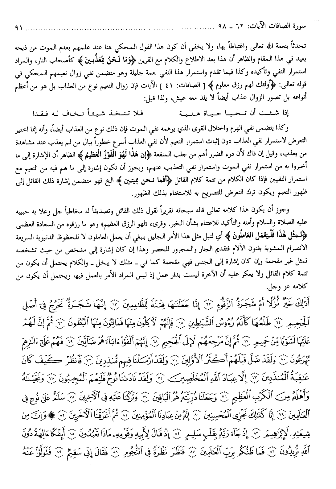 تحدثا بنعمة الله تعالى واغتباطا بها، ولا يخفى أن كون هذا القول المحكي هنا عند علمهم بعدم الموت من ذبحه بعيد في هذا المقام والظاهر أن هذا بعد الاطلاع والكلام مع القرين وَما نَحْنُ بِمُعَذَّبِينَ كأصحاب النار، والمراد استمرار النفي وتأكيده وكذا فيما تقدم واستمرار هذا النفي نعمة جليلة وهو متضمن نفي زوال نعيمهم المحكي في قوله تعالى: أُولئِكَ لَهُمْ رِزْقٌ مَعْلُومٌ [الصافات: 41] الآيات فإن زوال النعيم نوع من العذاب بل هو من أعظم أنواعه بل تصور الزوال عذاب أيضا لا يلذ معه عيش، ولذا قيل:
