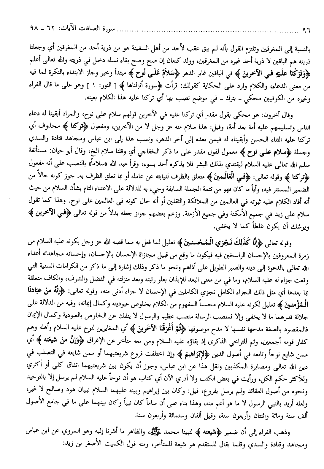 بالنسبة إلى المغرقين وتلتزم القول بأنه لم يبق عقب لأحد من أهل السفينة هو من ذرية أحد من المغرقين أي وجعلنا ذريته هم الباقين لا ذرية أحد غيره من المغرقين، وولد كنعان إن صح وصح بقاء نسله دخل في ذريته والله تعالى أعلم وَتَرَكْنا عَلَيْهِ فِي الْآخِرِينَ في الباقين غابر الدهر سَلامٌ عَلى نُوحٍ مبتدأ وخبر وجاز الابتداء بالنكرة لما فيه من معنى الدعاء، والكلام وارد على الحكاية كقولك: قرأت سُورَةٌ أَنْزَلْناها [النور: 1] وهو على ما قال الفراء وغيره من الكوفيين محكي- بترك- في موضع نصب بها أي تركنا عليه هذا الكلام بعينه.
