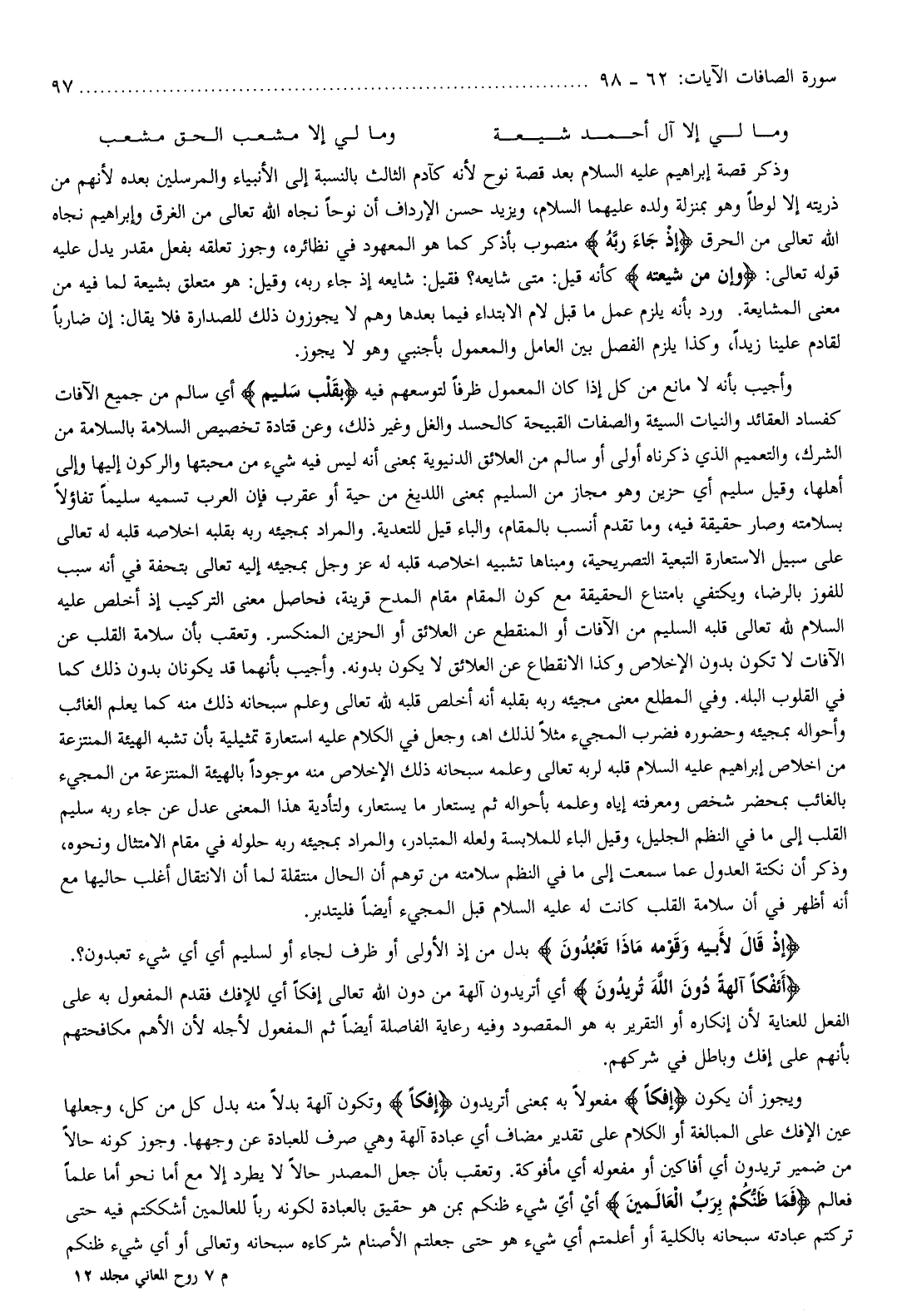 وأجيب بأنه لا مانع من كل إذا كان المعمول ظرفا لتوسعهم فيه بِقَلْبٍ سَلِيمٍ أي سالم من جميع الآفات كفساد العقائد والنيات السيئة والصفات القبيحة كالحسد والغل وغير ذلك، وعن قتادة تخصيص السلامة بالسلامة من الشرك، والتعميم الذي ذكرناه أولى أو سالم من العلائق الدنيوية بمعنى أنه ليس فيه شيء من محبتها والركون إليها وإلى أهلها، وقيل سليم أي حزين وهو مجاز من السليم بمعنى اللديغ من حية أو عقرب فإن العرب تسميه سليما تفاؤلا بسلامته وصار حقيقة فيه، وما تقدم أنسب بالمقام، والباء قيل للتعدية. والمراد بمجيئه ربه بقلبه إخلاصه قلبه له تعالى على سبيل الاستعارة التبعية التصريحية، ومبناها تشبيه إخلاصه قلبه له عز وجل بمجيئه إليه تعالى بتحفة في أنه سبب للفوز بالرضا، ويكتفي بامتناع الحقيقة مع كون المقام مقام المدح قرينة، فحاصل معنى التركيب إذ أخلص عليه السلام لله تعالى قلبه السليم من الآفات أو المنقطع عن العلائق أو الحزين المنكسر. وتعقب بأن سلامة القلب عن الآفات لا تكون بدون الإخلاص وكذا الانقطاع عن العلائق لا يكون بدونه. وأجيب بأنهما قد يكونان بدون ذلك كما في القلوب البله. وفي المطلع معنى مجيئه ربه بقلبه أنه أخلص قلبه لله تعالى وعلم سبحانه ذلك منه كما يعلم الغائب وأحواله بمجيئه وحضوره فضرب المجيء مثلا لذلك اه، وجعل في الكلام عليه استعارة تمثيلية بأن تشبه الهيئة المنتزعة من اخلاص إبراهيم عليه السلام قلبه لربه تعالى وعلمه سبحانه ذلك الإخلاص منه موجودا بالهيئة المنتزعة من المجيء بالغائب بمحضر شخص ومعرفته إياه وعلمه بأحواله ثم يستعار ما يستعار، ولتأدية هذا المعنى عدل عن جاء ربه سليم القلب إلى ما في النظم الجليل، وقيل الباء للملابسة ولعله المتبادر، والمراد بمجيئه ربه حلوله في مقام الامتثال ونحوه، وذكر أن نكتة العدول عما سمعت إلى ما في النظم سلامته من توهم أن الحال منتقلة لما أن الانتقال أغلب حاليها مع أنه أظهر في أن سلامة القلب كانت له عليه السلام قبل المجيء أيضا فليتدبر.