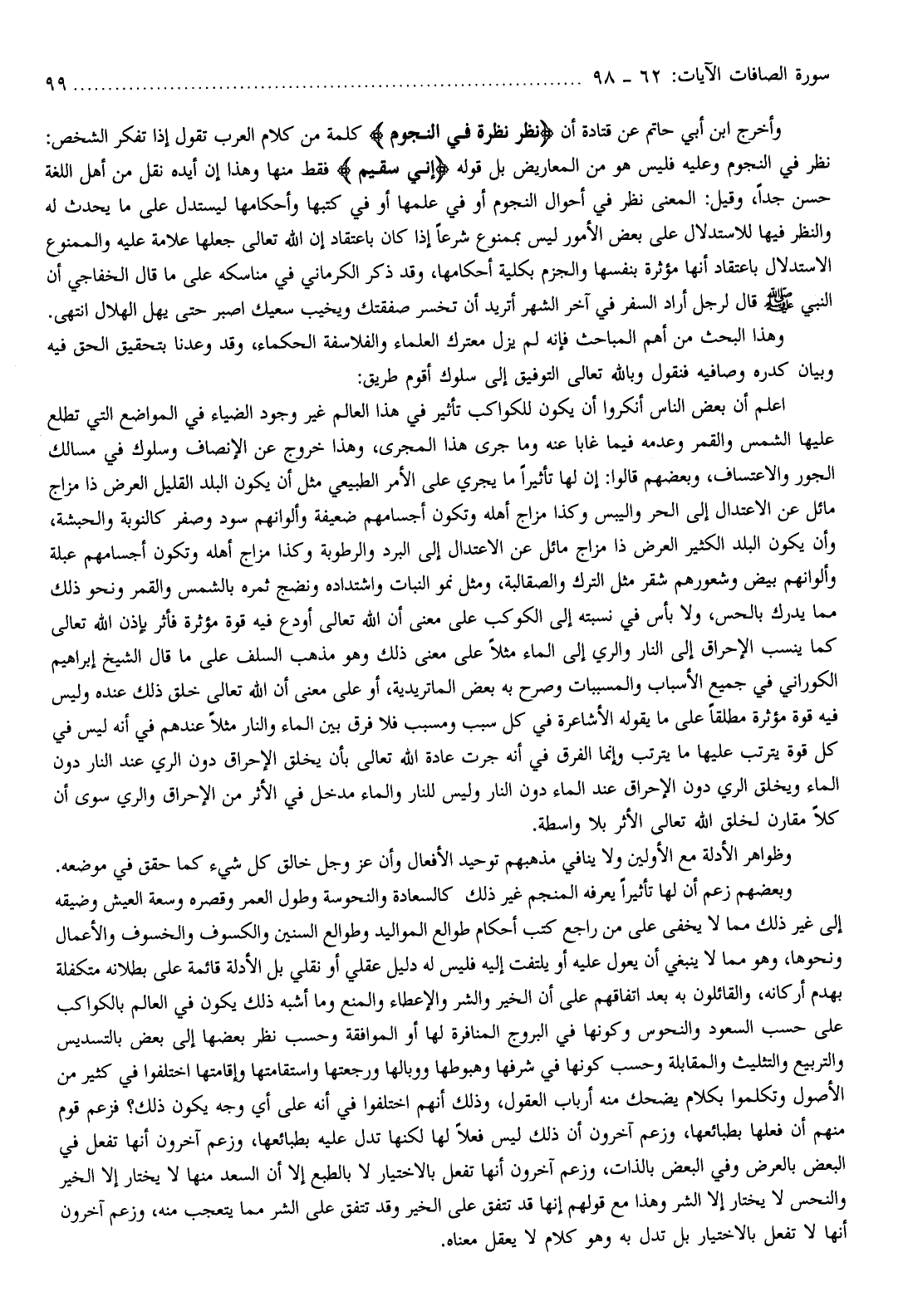 اعلم أن بعض الناس أنكروا أن يكون للكواكب تأثير في هذا العالم غير وجود الضياء في المواضع التي تطلع عليها الشمس والقمر وعدمه فيما غابا عنه وما جرى هذا المجرى، وهذا خروج عن الإنصاف وسلوك في مسالك الجور والاعتساف، وبعضهم قالوا: إن لها تأثيرا ما يجري على الأمر الطبيعي مثل أن يكون البلد القليل العرض ذا مزاج مائل عن الاعتدال إلى الحر واليبس وكذا مزاج أهله وتكون أجسامهم ضعيفة وألوانهم سود وصفر كالنوبة والحبشة، وأن يكون البلد الكثير العرض ذا مزاج مائل عن الاعتدال إلى البرد والرطوبة وكذا مزاج أهله وتكون أجسامهم عبلة وألوانهم بيض وشعورهم شقر مثل الترك والصقالبة، ومثل نمو النبات واشتداده ونضج ثمره بالشمس والقمر ونحو ذلك مما يدرك بالحس، ولا بأس في نسبته إلى الكوكب على معنى أن الله تعالى أودع فيه قوة مؤثرة فأثر بإذن الله تعالى كما ينسب الإحراق إلى النار والري إلى الماء مثلا على معنى ذلك وهو مذهب السلف على ما قال الشيخ إبراهيم الكوراني في جميع الأسباب والمسببات وصرح به بعض الماتريدية، أو على معنى أن الله تعالى خلق ذلك عنده وليس فيه قوة مؤثرة مطلقا على ما يقوله الأشاعرة في كل سبب ومسبب فلا فرق بين الماء والنار مثلا عندهم في أنه ليس في كل قوة يترتب عليها ما يترتب وإنما الفرق في أنه جرت عادة الله تعالى بأن يخلق الإحراق دون الري عند النار دون الماء ويخلق الري دون الإحراق عند الماء دون النار وليس للنار والماء مدخل في الأثر من الإحراق والري سوى أن كلا مقارن لخلق الله تعالى الأثر بلا واسطة.