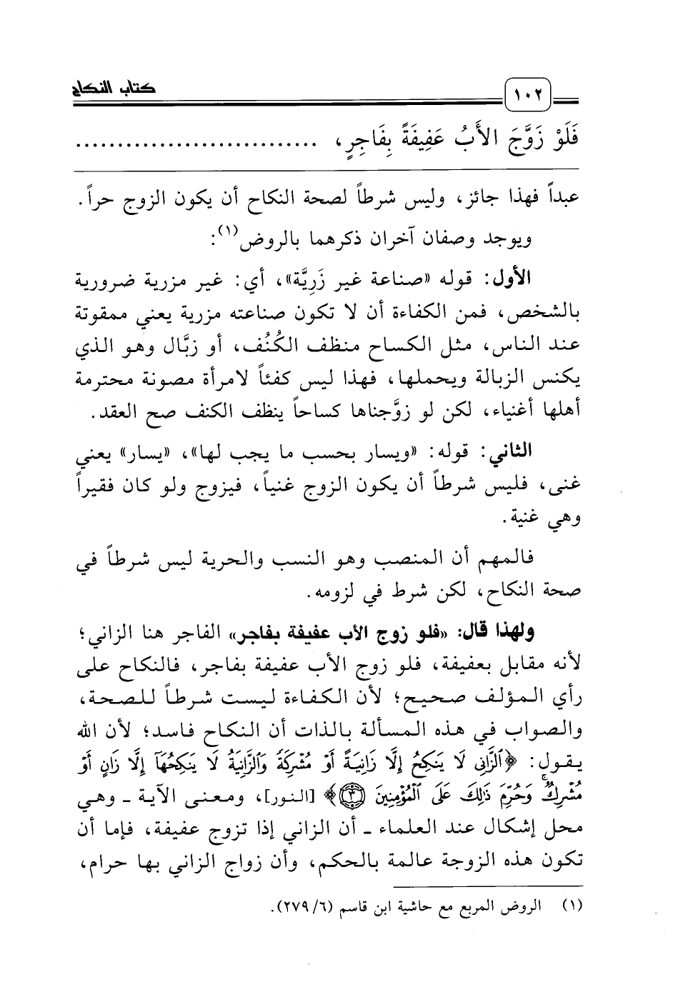 ولهذا قال: «فلو زوج الأب عفيفة بفاجر» الفاجر هنا الزاني؛ لأنه مقابل بعفيفة، فلو زوج الأب عفيفة بفاجر، فالنكاح على رأي المؤلف صحيح؛ لأن الكفاءة ليست شرطاً للصحة، والصواب في هذه المسألة بالذات أن النكاح فاسد؛ لأن الله يقول: {الزَّانِي لاَ يَنْكِحُ إِلاَّ زَانِيَةً أَوْ مُشْرِكَةً وَالزَّانِيَةُ لاَ يَنْكِحُهَا إِلاَّ زَانٍ أَوْ مُشْرِكٌ وَحُرِّمَ ذَلِكَ عَلَى الْمُؤْمِنِينَ *} [النور]، ومعنى الآية ـ وهي محل إشكال عند العلماء ـ أن الزاني إذا تزوج عفيفة، فإما أن تكون هذه الزوجة عالمة بالحكم، وأن زواج الزاني بها حرام،