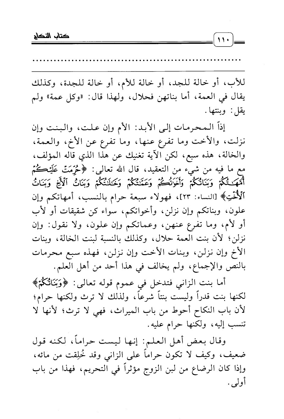 إذاً المحرمات إلى الأبد: الأم وإن علت، والبنت وإن نزلت، والأخت وما تفرع عنها، وما تفرع عن الأخ، والعمة، والخالة، هذه سبع، لكن الآية تغنيك عن هذا الذي قاله المؤلف، مع ما فيه من شيء من التعقيد، قال الله تعالى: {حُرِّمَتْ عَلَيْكُمْ أُمَهَاتُكُمْ وَبَنَاتُكُمْ وَأَخَوَاتُكُمْ وَعَمَّاتُكُمْ وَخَالاَتُكُمْ وَبَنَاتُ الأَخِ وَبَنَاتُ الأُخْتِ} [النساء: 23]، فهولاء سبعة حرام بالنسب، أمهاتكم وإن علون، وبناتكم وإن نزلن، وأخواتكم، سواء كن شقيقات أو لأب أو لأم، وما تفرع عنهن، وعماتكم وإن علون، ولا نقول: وإن نزلن؛ لأن بنت العمة حلال، وكذلك بالنسبة لبنت الخالة، وبنات الأخ وإن نزلن، وبنات الأخت وإن نزلن، فهذه سبع محرمات بالنص والإجماع، ولم يخالف في هذا أحد من أهل العلم.