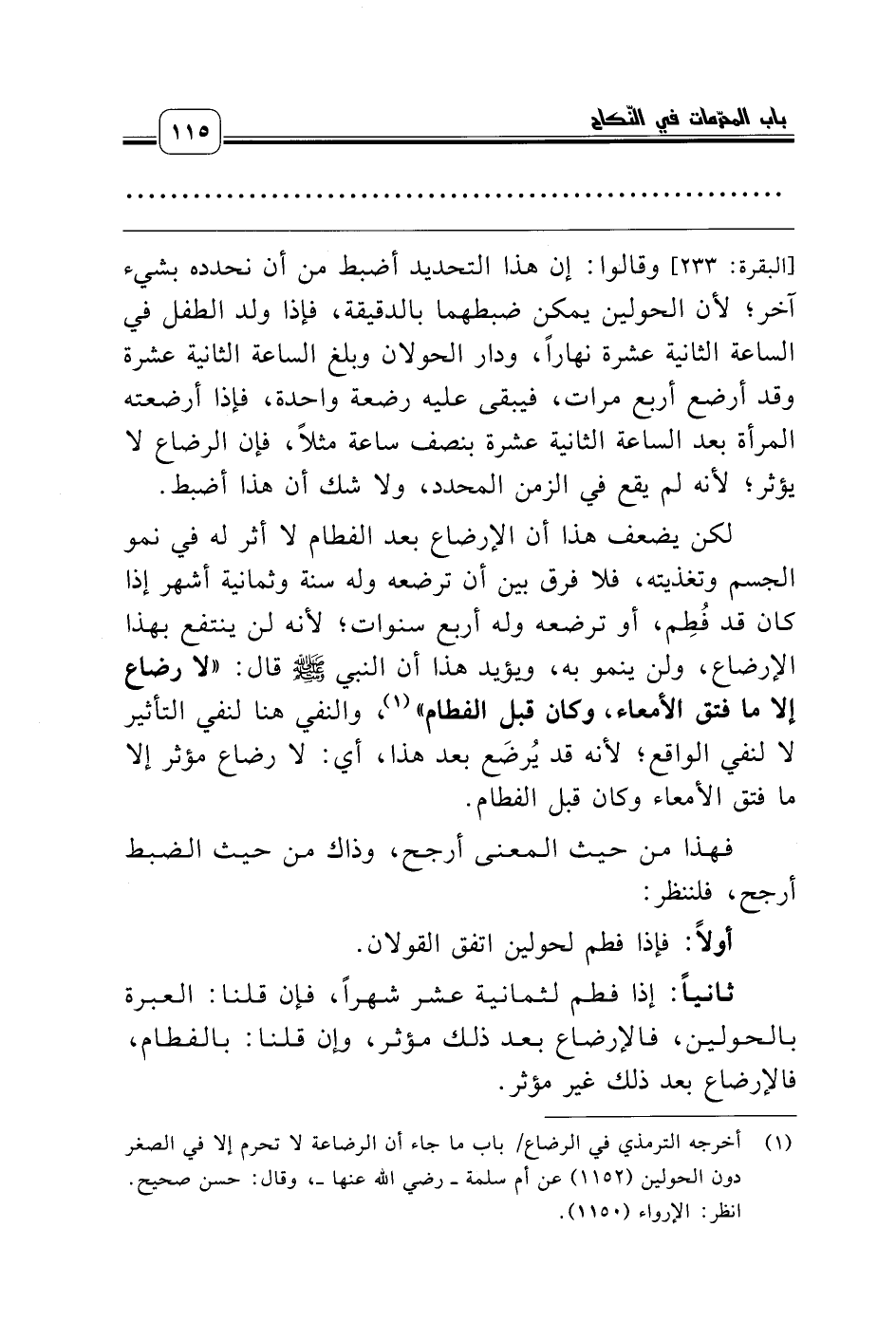 لكن يضعف هذا أن الإرضاع بعد الفطام لا أثر له في نمو الجسم وتغذيته، فلا فرق بين أن ترضعه وله سنة وثمانية أشهر إذا كان قد فُطِم، أو ترضعه وله أربع سنوات؛ لأنه لن ينتفع بهذا الإرضاع، ولن ينمو به، ويؤيد هذا أن النبي صلّى الله عليه وسلّم قال: «لا رضاع إلا ما فتق الأمعاء، وكان قبل الفطام» (¬1)، والنفي هنا لنفي التأثير لا لنفي الواقع؛ لأنه قد يُرضَع بعد هذا، أي: لا رضاع مؤثر إلا ما فتق الأمعاء وكان قبل الفطام.