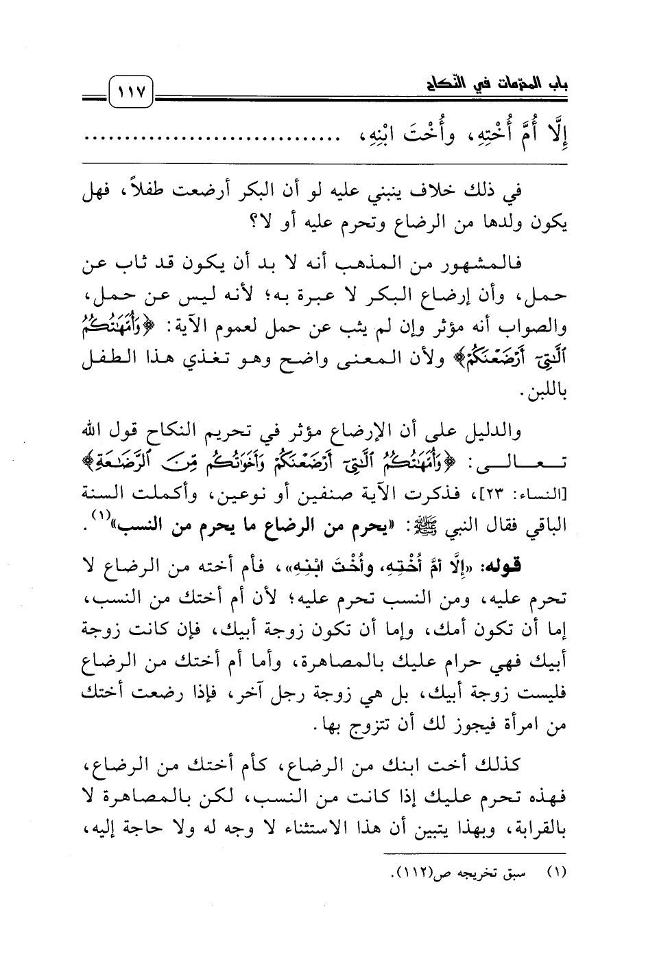 قوله: «إِلاَّ أمَّ أُخْتِهِ، وأُخْتَ ابْنِهِ»، فأم أخته من الرضاع لا تحرم عليه، ومن النسب تحرم عليه؛ لأن أم أختك من النسب، إما أن تكون أمك، وإما أن تكون زوجة أبيك، فإن كانت زوجة أبيك فهي حرام عليك بالمصاهرة، وأما أم أختك من الرضاع فليست زوجة أبيك، بل هي زوجة رجل آخر، فإذا رضعت أختك من امرأة فيجوز لك أن تتزوج بها.