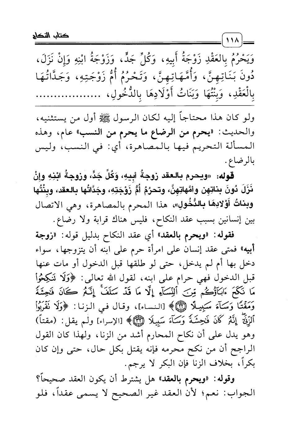 وَيَحْرُمُ بِالعَقْدِ زَوْجَةُ أَبِيهِ، وَكُلِّ جَدٍّ، وَزَوْجَةُ ابْنِهِ وَإِنْ نَزَلَ، دُونَ بَنَاتِهِنَّ، وَأُمَّهَاتِهِنَّ، وَتَحْرُمُ أُمُّ زَوْجَتِهِ، وَجَدَّاتُهَا بِالْعَقْدِ، وَبِنْتُهَا وَبَنَاتُ أَوْلاَدِهَا بِالدُّخُولِ، ..........