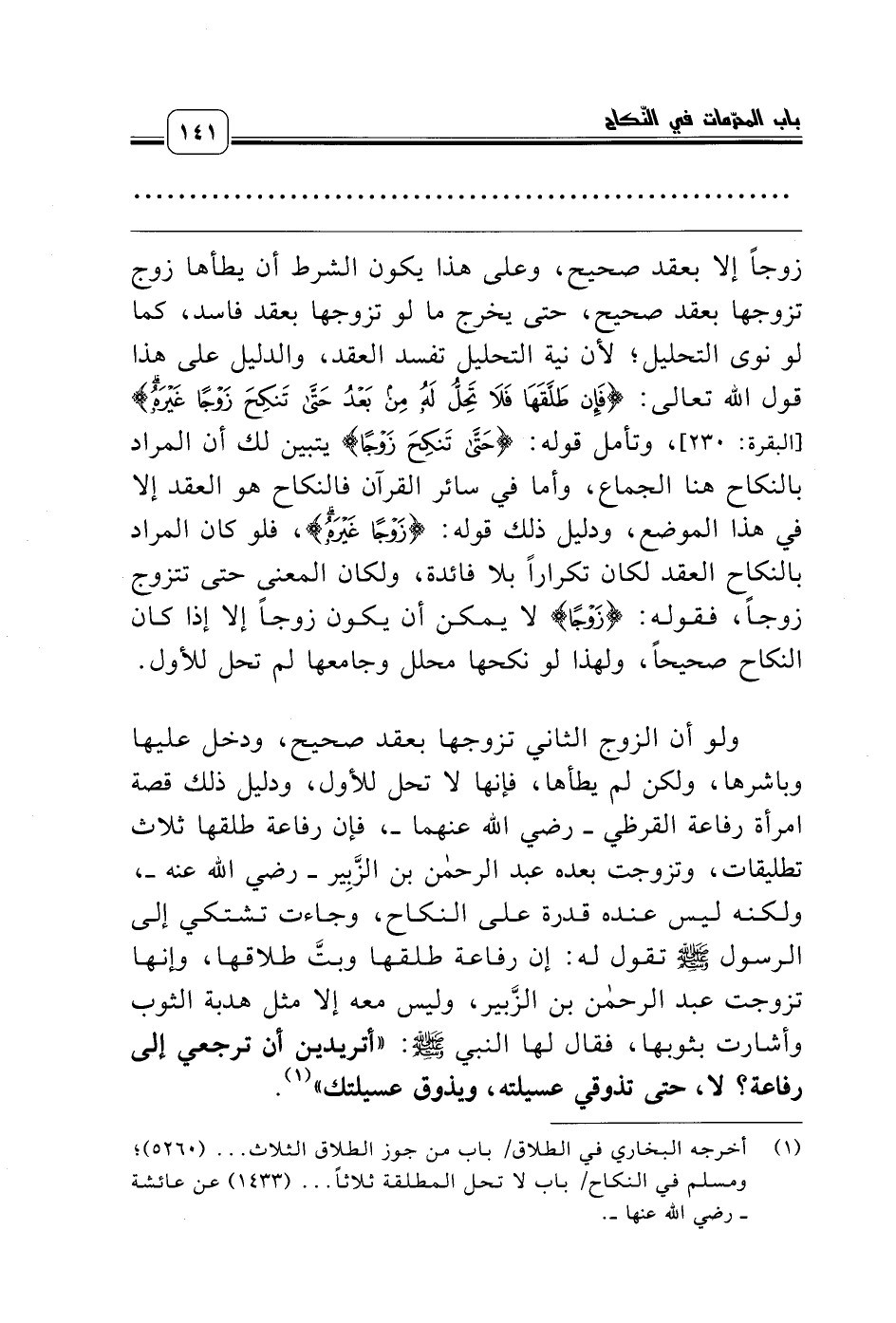 (¬1) أخرجه البخاري في الطلاق/ باب من جوز الطلاق الثلاث ... (5260)؛ ومسلم في النكاح/ باب لا تحل المطلقة ثلاثاً ... (1433) عن عائشة ـ رضي الله عنها ـ.