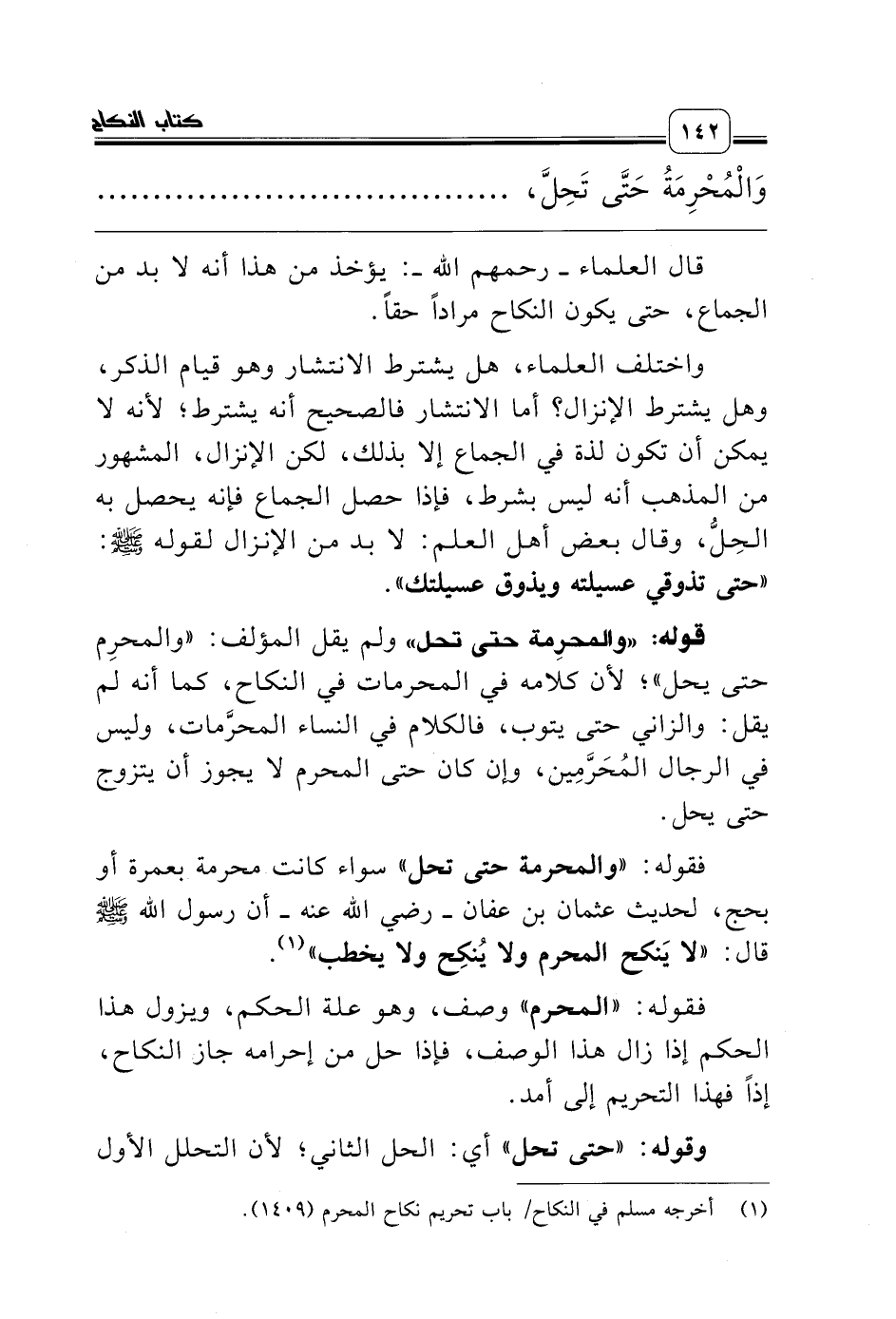فقوله: «والمحرمة حتى تحل» سواء كانت محرمة بعمرة أو بحج، لحديث عثمان بن عفان ـ رضي الله عنه ـ أن رسول الله صلّى الله عليه وسلّم قال: «لا يَنكح المحرم ولا يُنكِح ولا يخطب» (¬1).