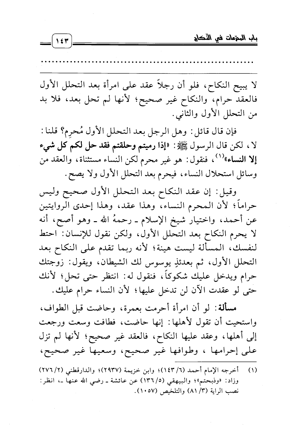 وقيل: إن عقد النكاح بعد التحلل الأول صحيح وليس حراماً؛ لأن المحرم النساء، وهذا عقد، وهذا إحدى الروايتين عن أحمد، واختيار شيخ الإسلام ـ رحمه الله ـ وهو أصح، أنه لا يحرم النكاح بعد التحلل الأول، ولكن نقول للإنسان: احتط لنفسك، المسألة ليست هينة؛ لأنه ربما تقدم على النكاح بعد التحلل الأول، ثم بعدئذٍ يوسوس لك الشيطان، ويقول: زوجتك حرام ويدخل عليك شكوكاً، فنقول له: انتظر حتى تحل؛ لأنك حتى لو عقدت الآن لن تدخل عليها؛ لأن النساء حرام عليك.